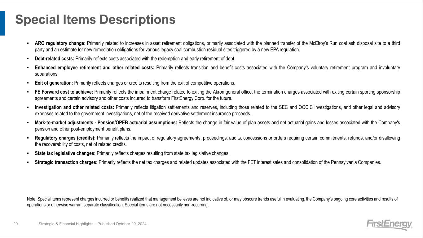 Special Items Descriptions Strategic & Financial Highlights – Published October 29, 2024 ▪ ARO regulatory change: Primarily related to increases in asset retirement obligations, primarily associated with the planned transfer of the McElroy’s Run coal ash disposal site to a third party and an estimate for new remediation obligations for various legacy coal combustion residual sites triggered by a new EPA regulation. ▪ Debt-related costs: Primarily reflects costs associated with the redemption and early retirement of debt. ▪ Enhanced employee retirement and other related costs: Primarily reflects transition and benefit costs associated with the Company's voluntary retirement program and involuntary separations. ▪ Exit of generation: Primarily reflects charges or credits resulting from the exit of competitive operations. ▪ FE Forward cost to achieve: Primarily reflects the impairment charge related to exiting the Akron general office, the termination charges associated with exiting certain sporting sponsorship agreements and certain advisory and other costs incurred to transform FirstEnergy Corp. for the future. ▪ Investigation and other related costs: Primarily reflects litigation settlements and reserves, including those related to the SEC and OOCIC investigations, and other legal and advisory expenses related to the government investigations, net of the received derivative settlement insurance proceeds. ▪ Mark-to-market adjustments - Pension/OPEB actuarial assumptions: Reflects the change in fair value of plan assets and net actuarial gains and losses associated with the Company's pension and other post-employment benefit plans. ▪ Regulatory charges (credits): Primarily reflects the impact of regulatory agreements, proceedings, audits, concessions or orders requiring certain commitments, refunds, and/or disallowing the recoverability of costs, net of related credits. ▪ State tax legislative changes: Primarily reflects charges resulting from state tax legislative changes. ▪ Strategic transaction charges: Primarily reflects the net tax charges and related updates associated with the FET interest sales and consolidation of the Pennsylvania Companies. Note: Special items represent charges incurred or benefits realized that management believes are not indicative of, or may obscure trends useful in evaluating, the Company’s ongoing core activities and results of operations or otherwise warrant separate classification. Special items are not necessarily non-recurring. 20