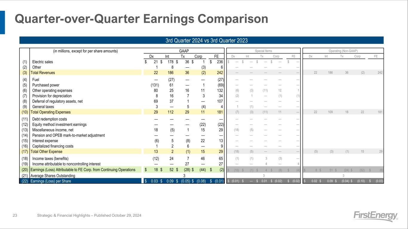 Quarter-over-Quarter Earnings Comparison Strategic & Financial Highlights – Published October 29, 2024 3rd Quarter 2024 vs 3rd Quarter 2023 (in millions, except for per share amounts) GAAP Special Items Operating (Non-GAAP) Dx Int Tx Corp FE Dx Int Tx Corp FE Dx Int Tx Corp FE (1) Electric sales $ 21 $ 178 $ 36 $ 1 $ 236 $ — $ — $ — $ — $ — $ 21 $ 178 $ 36 $ 1 $ 236 (2) Other 1 8 — (3) 6 — — — — — 1 8 — (3) 6 (3) Total Revenues 22 186 36 (2) 242 — — — — — 22 186 36 (2) 242 (4) Fuel — (27) — — (27) — — — — — — (27) — — (27) (5) Purchased power (131) 61 — 1 (69) — — — — — (131) 61 — 1 (69) (6) Other operating expenses 80 25 16 11 132 (6) (3) (11) 12 1 74 22 5 23 133 (7) Provision for depreciation 8 16 7 3 34 (2) 1 — (1) (1) 6 17 7 2 33 (8) Deferral of regulatory assets, net 69 37 1 — 107 — — — — — 69 37 1 — 107 (9) General taxes 3 — 5 (4) 4 1 (1) — — — 4 (1) 5 (4) 4 (10) Total Operating Expenses 29 112 29 11 181 (7) (3) (11) 11 — 22 109 18 22 181 (11) Debt redemption costs — — — — — — — — — — — — — — — (12) Equity method investment earnings — — — (22) (22) — — — — — — — — (22) (22) (13) Miscellaneous income, net 18 (5) 1 15 29 (18) (5) — — — — (10) 1 15 29 (14) Pension and OPEB mark-to-market adjustment — — — — — — — — — — — — — — — (15) Interest expense (6) 5 (8) 22 13 — — — — — (6) 5 (8) 22 13 (16) Capitalized financing costs 1 2 6 — 9 — — — — — 1 2 6 — 9 (17) Total Other Expense 13 2 (1) 15 29 (18) (5) — — — (5) (3) (1) 15 29 (18) Income taxes (benefits) (12) 24 7 46 65 (1) (1) 3 (3) — (13) 23 10 43 65 (19) Income attributable to noncontrolling interest — — 27 — 27 — — 4 — 4 — — 31 — 31 (20) Earnings (Loss) Attributable to FE Corp. from Continuing Operations $ 18 $ 52 $ (28) $ (44) $ (2) $ (10) $ (1) $ 4 $ (8) $ (4) $ 8 $ 51 $ (24) $ (52) $ (6) (21) Average Shares Outstanding 3 3 3 (22) Earnings (Loss) per Share $ 0.03 $ 0.09 $ (0.05) $ (0.08) $ (0.01) $ (0.01) $ — $ 0.01 $ (0.02) $ (0.02) $ 0.02 $ 0.09 $ (0.04) $ (0.10) $ (0.03) 23