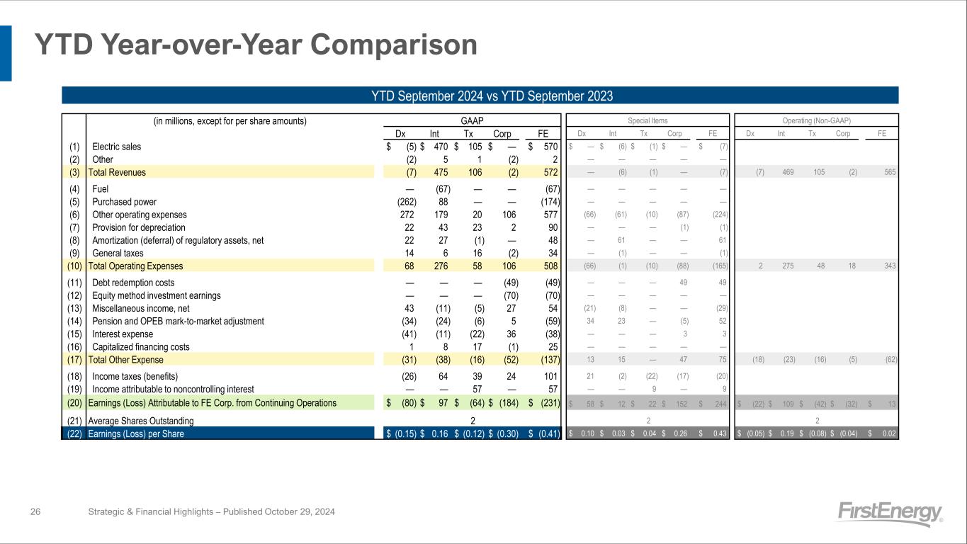 YTD 2023 Earnings Results Strategic & Financial Highlights – Published October 29, 2024 YTD September 2023 (in millions, except for per share amounts) GAAP Special Items Operating (Non-GAAP) Dx Int Tx Corp FE Dx Int Tx Corp FE Dx Int Tx Corp FE (1) Electric sales $ 5,115 $ 3,206 $ 1,262 $ 6 $ 9,589 $ — $ 6 (g) $ 1 (g) $ — $ 7 $ 5,115 $ 3,212 $ 1,263 $ 6 $ 9,596 (2) Other 124 44 13 (46) 135 — — — — — 124 44 13 (46) 135 (3) Total Revenues 5,239 3,250 1,275 (40) 9,724 — 6 1 — 7 5,239 3,256 1,276 (40) 9,731 (4) Fuel — 439 — — 439 — — — — — — 439 — — 439 (5) Purchased power 1,985 1,172 — 16 3,173 — — — — — 1,985 1,172 — 16 3,173 (6) Other operating expenses 1,599 862 260 (23) 2,698 (55) (b)(d)(g) (32) (b)(d)(g) (1) (g) (98) (c)(d)(e) (186) 1,544 830 259 (121) 2,512 (7) Provision for depreciation 464 343 226 55 1,088 (3) (d) (1) (d) — — (4) 461 342 226 55 1,084 (8) Amortization (deferral) of regulatory assets, net (174) (85) 6 — (253) — — — — — (174) (85) 6 — (253) (9) General taxes 555 98 193 35 881 (1) (d) — — — (1) 554 98 193 35 880 (10) Total Operating Expenses 4,429 2,829 685 83 8,026 (59) (33) (1) (98) (191) 4,370 2,796 684 (15) 7,835 (11) Debt redemption costs — — — (36) (36) — — — 36 (a) 36 — — — — — (12) Equity method investment earnings — — — 134 134 — — — — — — — — 134 134 (13) Miscellaneous income, net 58 50 17 (23) 102 21 (b)(g) 8 (b) — — 29 79 58 17 (23) 131 (14) Pension and OPEB mark-to-market adjustment 34 24 6 (5) 59 (34) (f) (23) (f) — 5 (f) (52) — 1 6 — 7 (15) Interest expense (290) (187) (179) (172) (828) — — — — — (290) (187) (179) (172) (828) (16) Capitalized financing costs 16 25 26 2 69 — — — — — 16 25 26 2 69 (17) Total Other Expense (182) (88) (130) (100) (500) (13) (15) — 41 13 (195) (103) (130) (59) (487) (18) Income taxes (benefits) 122 43 102 (74) 193 10 (b)(d)(f)(g)(h) 5 (b)(d)(f)(g) 1 (g) 30 (a)(c)(d)(e)(f) 46 132 48 103 (44) 239 (19) Income attributable to noncontrolling interest — — 57 — 57 — — — — — — — 57 — 57 (20) Earnings (Loss) Attributable to FE Corp. from Continuing Operations $ 506 $ 290 $ 301 $ (149) $ 948 $ 36 $ 19 $ 1 $ 109 $ 165 $ 542 $ 309 $ 302 $ (40) $ 1,113 (21) Average Shares Outstanding 573 573 573 (22) Earnings (Loss) per Share $ 0.89 $ 0.51 $ 0.53 $ (0.27) $ 1.66 $ 0.06 $ 0.03 $ — $ 0.19 $ 0.28 $ 0.95 $ 0.54 $ 0.53 $ (0.08) $ 1.94 Special Items (after-tax impact): (a) (a) Debt-related costs $ — $ — $ — $ 29 $ 29 (b) (b) Enhanced employee retirement and other related costs 35 25 — — 60 (c) (c) Exit of generation — — — 8 8 (d) (d) FE Forward cost to achieve 11 5 — 26 42 (e) (e) Investigation and other related costs — — — 42 42 (f) (f) Mark-to-market adjustments - Pension/OPEB actuarial assumptions (26) (16) — 4 (38) (g) (g) Regulatory charges 15 5 1 — 21 (h) (h) State tax legislative change 1 — — — 1 Impact to Earnings $ 36 $ 19 $ 1 $ 109 $ 165 25
