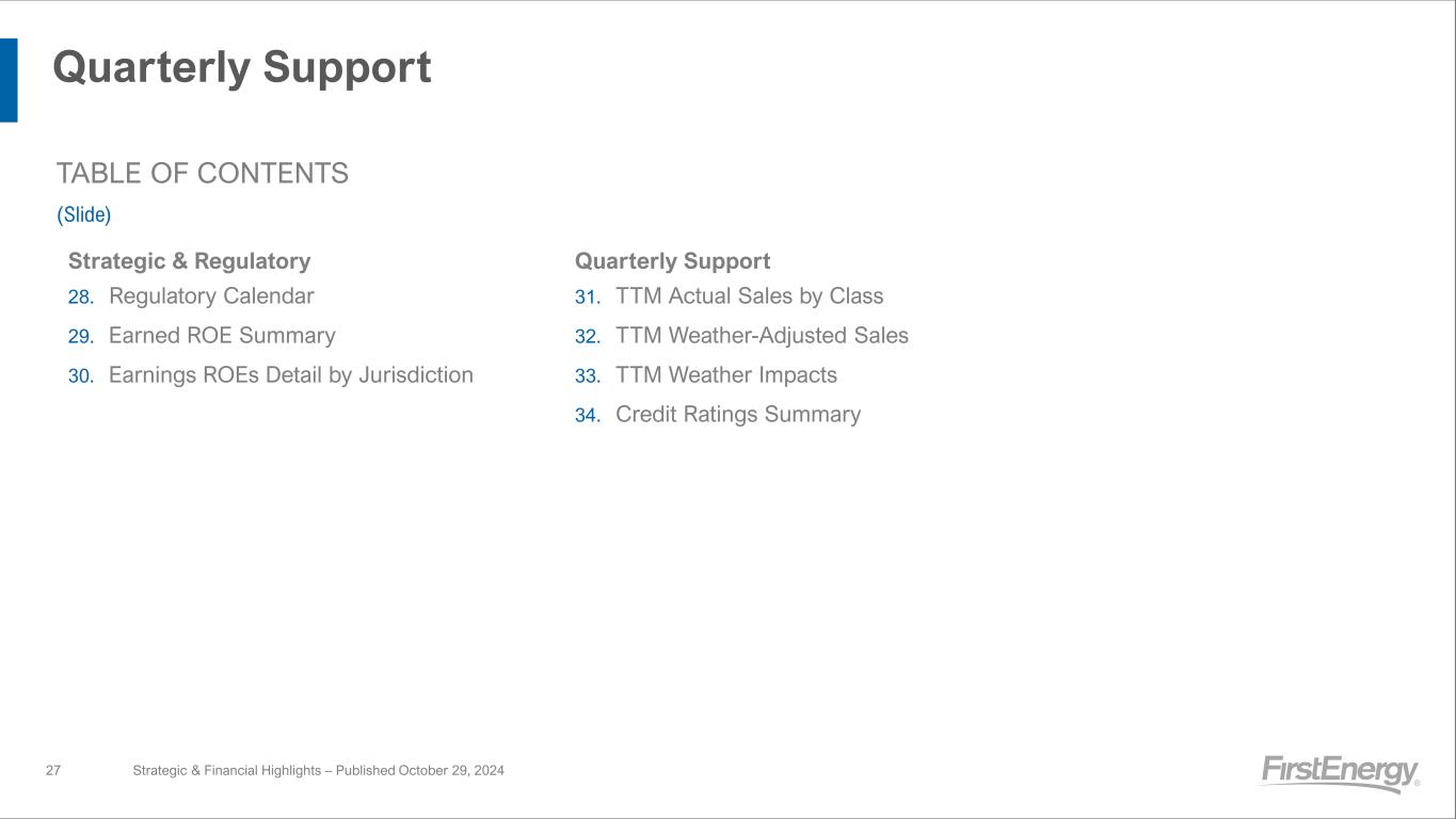 Quarterly Support Strategic & Financial Highlights – Published October 29, 2024 Strategic & Regulatory 28. Regulatory Calendar 29. Earned ROE Summary 30. Earnings ROEs Detail by Jurisdiction TABLE OF CONTENTS (Slide) Quarterly Support 31. TTM Actual Sales by Class 32. TTM Weather-Adjusted Sales 33. TTM Weather Impacts 34. Credit Ratings Summary 27