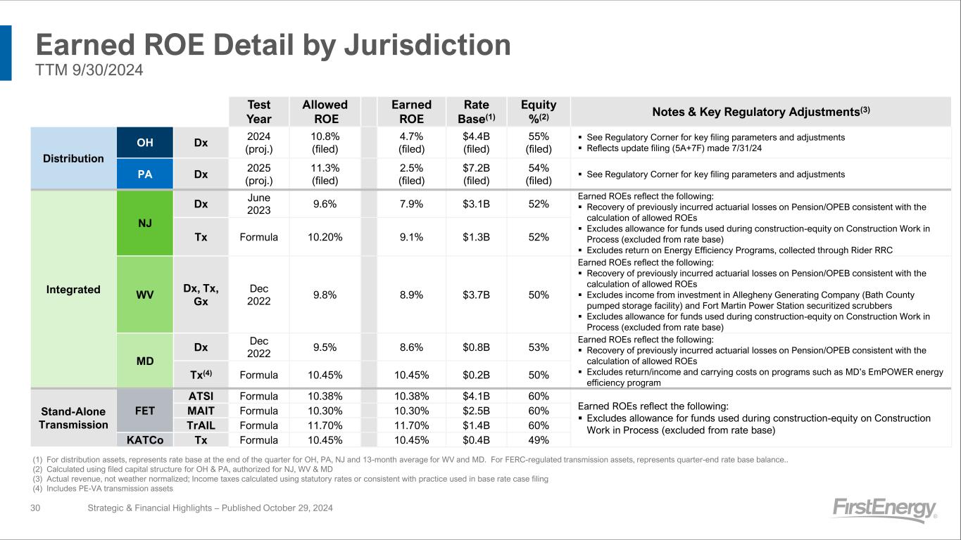 Earned ROE (Weighted Avg) 4.7% 2.5% 8.3% 8.9% 9.0% 10.7% 10.45% 0% 5% 10% OH PA NJ WV MD FET TransCos KATCo Earned ROE Summary TTM 9/30/2024 (see next slide for details by jurisdiction) Distribution Integrated Stand-Alone Transmission Rate Base $4.4B $7.2B $4.4B $3.7B $1.0B $8.0B $0.4B FE EPS Sensitivity Annual ROE (+/- 100 bps) ~$0.04 ~$0.07 ~$0.04 ~$0.03 ~$0.01 ~$0.04 <$0.01 % of Total Rate Base 15% 25% 15% 13% 3% 28% 2% As filed in pending rate case (1) Commentary on recent/current base rate cases ▪ OH: Filed base rate request for approximately $94M on 5/31/24; updated request for $190M filed 7/31/24; Requested ROE is 10.8% ▪ PA: Filed base rate case request for $502M on 4/2/24, Settlement Agreement filed 9/13/24; Order anticipated December 2024, with rates effective January 2025 ▪ NJ: Implementation of base rate case effective 2/15/24, with rates effective for customers on 6/1/24, of $85M annually ▪ WV: Implementation of new base rates effective 3/27/24 of $105M annually ▪ MD: Implementation of new base rates effective 10/19/23 of $29M annually (1) ROE and rate base represent the filed position by the Company in its pending rate case before revenue adjustment. (2) NJ and MD include distribution and transmission. WV includes distribution, transmission, and generation. (3) Includes weighted average ROE of ATSI, MAIT, and TrAILCo and excludes impact of interest on FET, LLC Hold Co debt, which approximates $100M annually (3)(2)(2) (2) Note: Numbers may not foot due to rounding Strategic & Financial Highlights – Published October 29, 2024 As filed in pending rate case update (1) 29