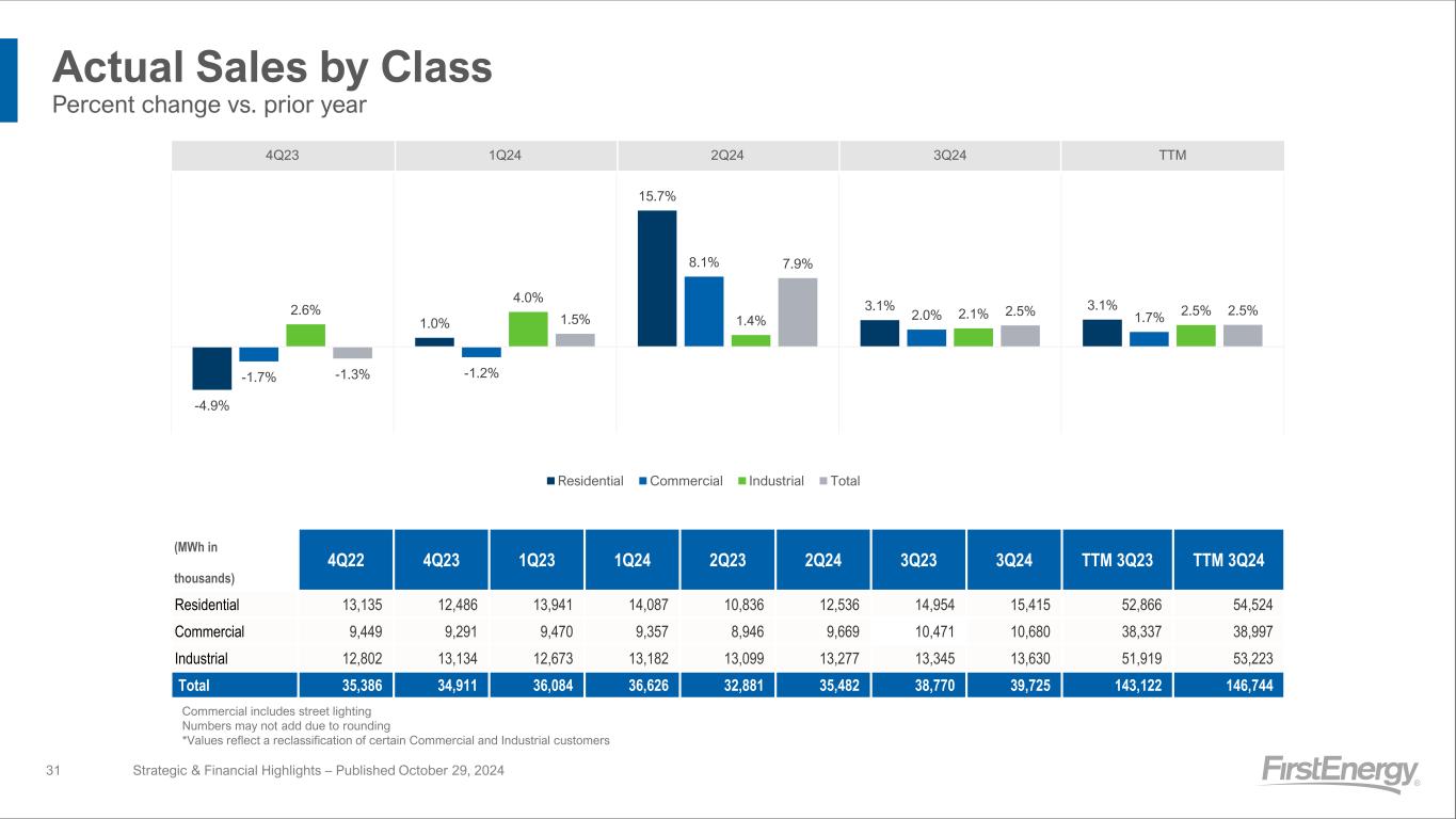 Actual Sales by Class Percent change vs. prior year Commercial includes street lighting Numbers may not add due to rounding *Values reflect a reclassification of certain Commercial and Industrial customers Strategic & Financial Highlights – Published October 29, 2024 (MWh in 4Q22 4Q23 1Q23 1Q24 2Q23 2Q24 3Q23 3Q24 TTM 3Q23 TTM 3Q24 thousands) Residential 13,135 12,486 13,941 14,087 10,836 12,536 14,954 15,415 52,866 54,524 Commercial 9,449 9,291 9,470 9,357 8,946 9,669 10,471 10,680 38,337 38,997 Industrial 12,802 13,134 12,673 13,182 13,099 13,277 13,345 13,630 51,919 53,223 Total 35,386 34,911 36,084 36,626 32,881 35,482 38,770 39,725 143,122 146,744 -4.9% 1.0% 15.7% 3.1% 3.1% -1.7% -1.2% 8.1% 2.0% 1.7% 2.6% 4.0% 1.4% 2.1% 2.5% -1.3% 1.5% 7.9% 2.5% 2.5% 4Q23 1Q24 2Q24 3Q24 TTM Residential Commercial Industrial Total 31