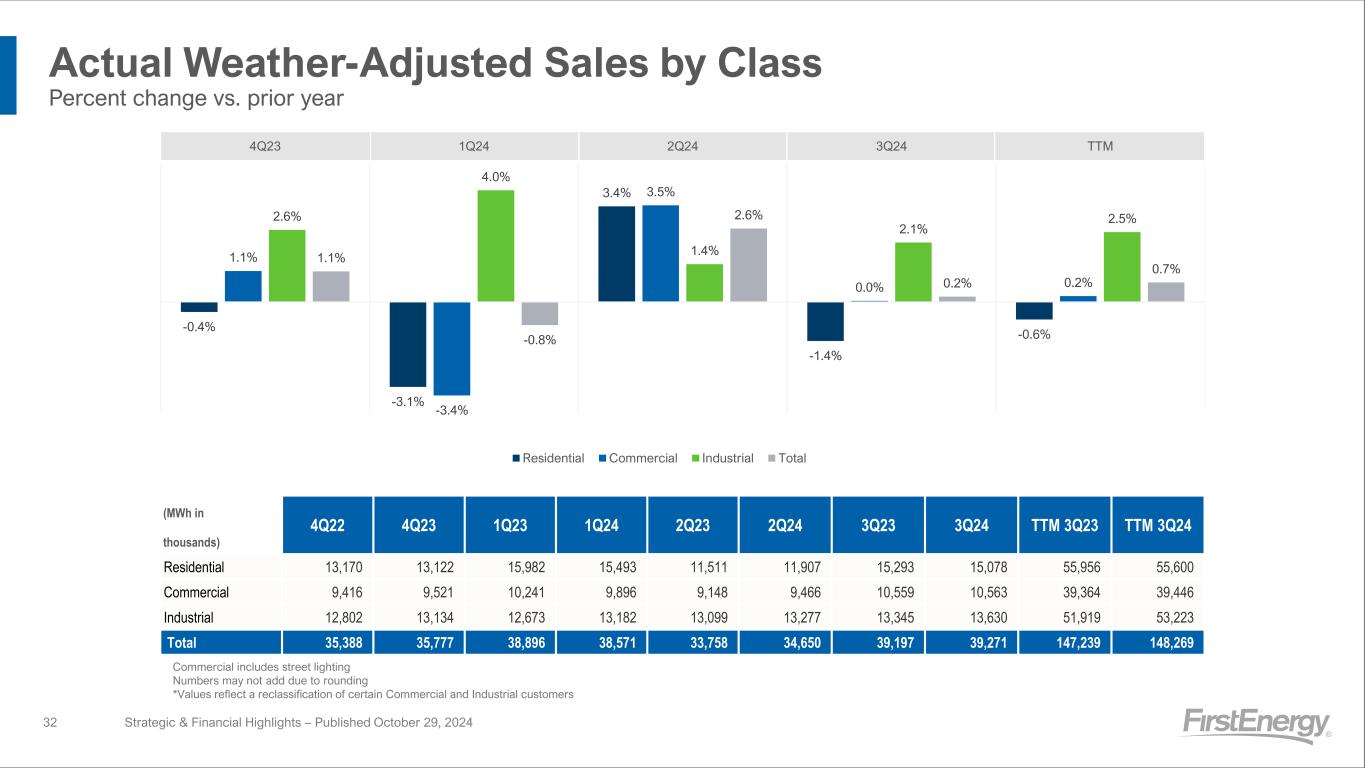 Operating results for the first nine months of 2024 reflect continued growth from the company’s regulated investment strategy, the impact of base rate adjustments, higher weather-related distribution sales mostly from the milder temperatures in 2023, and lower net interest expense compared to the first nine months of 2023. These factors more than offset the impact of higher storm restoration and planned operating expenses and the dilutive effect of the sale of the company’s 30% interest in FirstEnergy Transmission, LLC.