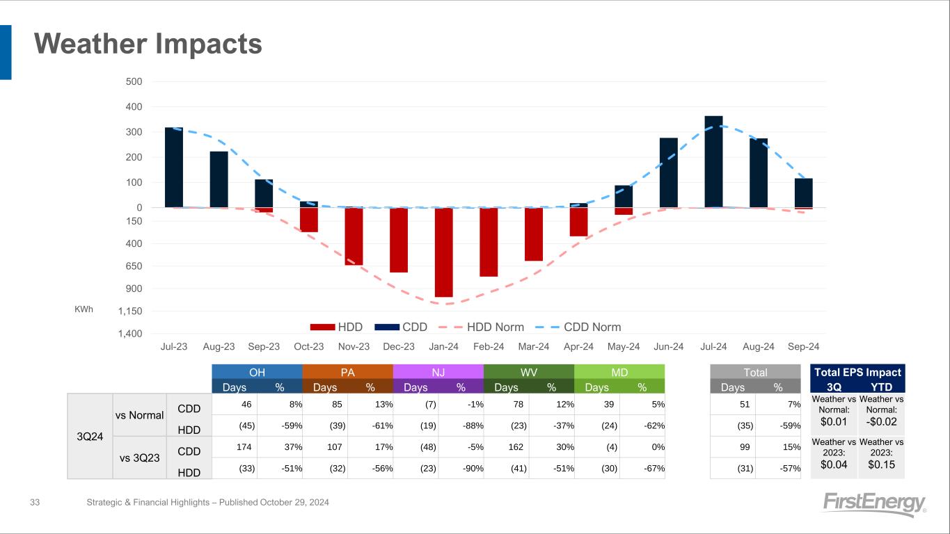 Weather Impacts KWh Strategic & Financial Highlights – Published October 29, 2024 Total EPS Impact 3Q YTD Weather vs Normal: Weather vs Normal: $0.01 -$0.02 Weather vs 2023: Weather vs 2023: $0.04 $0.15 OH PA NJ WV MD Total Days % Days % Days % Days % Days % Days % 3Q24 vs Normal CDD 46 8% 85 13% (7) -1% 78 12% 39 5% 51 7% HDD (45) -59% (39) -61% (19) -88% (23) -37% (24) -62% (35) -59% vs 3Q23 CDD 174 37% 107 17% (48) -5% 162 30% (4) 0% 99 15% HDD (33) -51% (32) -56% (23) -90% (41) -51% (30) -67% (31) -57% 0 100 200 300 400 500 1,400 1,150 900 650 400 150 Jul-23 Aug-23 Sep-23 Oct-23 Nov-23 Dec-23 Jan-24 Feb-24 Mar-24 Apr-24 May-24 Jun-24 Jul-24 Aug-24 Sep-24 HDD CDD HDD Norm CDD Norm 33