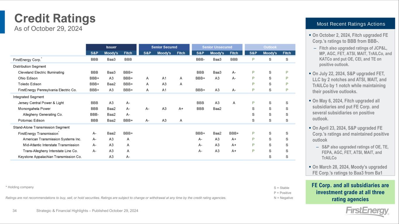 ▪ On October 2, 2024, Fitch upgraded FE Corp.’s ratings to BBB from BBB-. ‒ Fitch also upgraded ratings of JCP&L, MP, AGC, FET, ATSI, MAIT, TrAILCo, and KATCo and put OE, CEI, and TE on positive outlook. ▪ On July 22, 2024, S&P upgraded FET, LLC by 2 notches and ATSI, MAIT, and TrAILCo by 1 notch while maintaining their positive outlooks. ▪ On May 6, 2024, Fitch upgraded all subsidiaries and put FE Corp. and several subsidiaries on positive outlook. ▪ On April 23, 2024, S&P upgraded FE Corp.’s ratings and maintained positive outlook ‒ S&P also upgraded ratings of OE, TE, FEPA, AGC, FET, ATSI, MAIT, and TrAILCo ▪ On March 28, 2024, Moody’s upgraded FE Corp.’s ratings to Baa3 from Ba1 Credit Ratings As of October 29, 2024 Strategic & Financial Highlights – Published October 29, 2024 Most Recent Ratings Actions * Holding company S = Stable P = Positive Ratings are not recommendations to buy, sell, or hold securities. Ratings are subject to change or withdrawal at any time by the credit rating agencies. N = Negative FE Corp. and all subsidiaries are investment grade at all three rating agencies 34