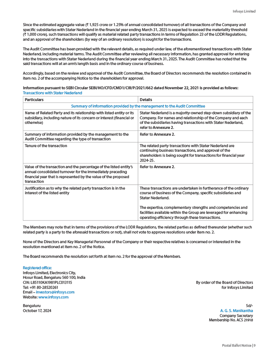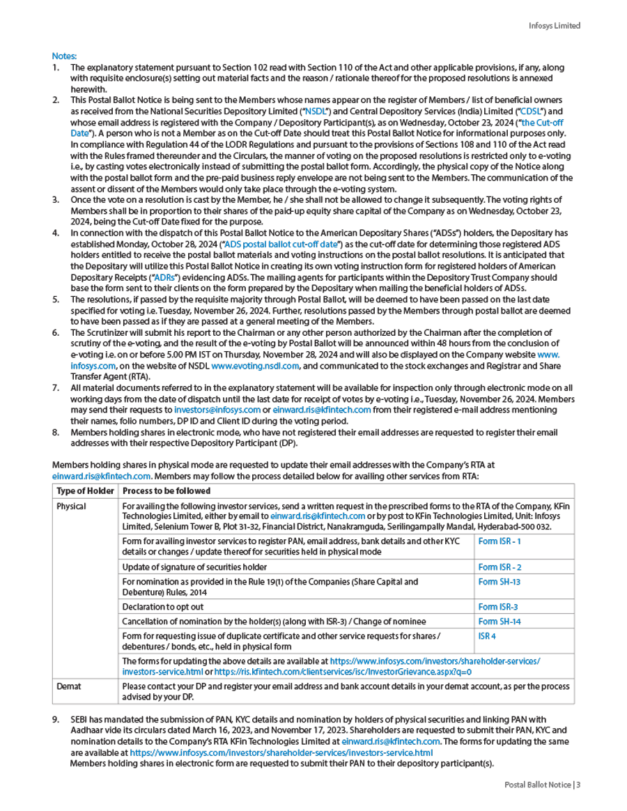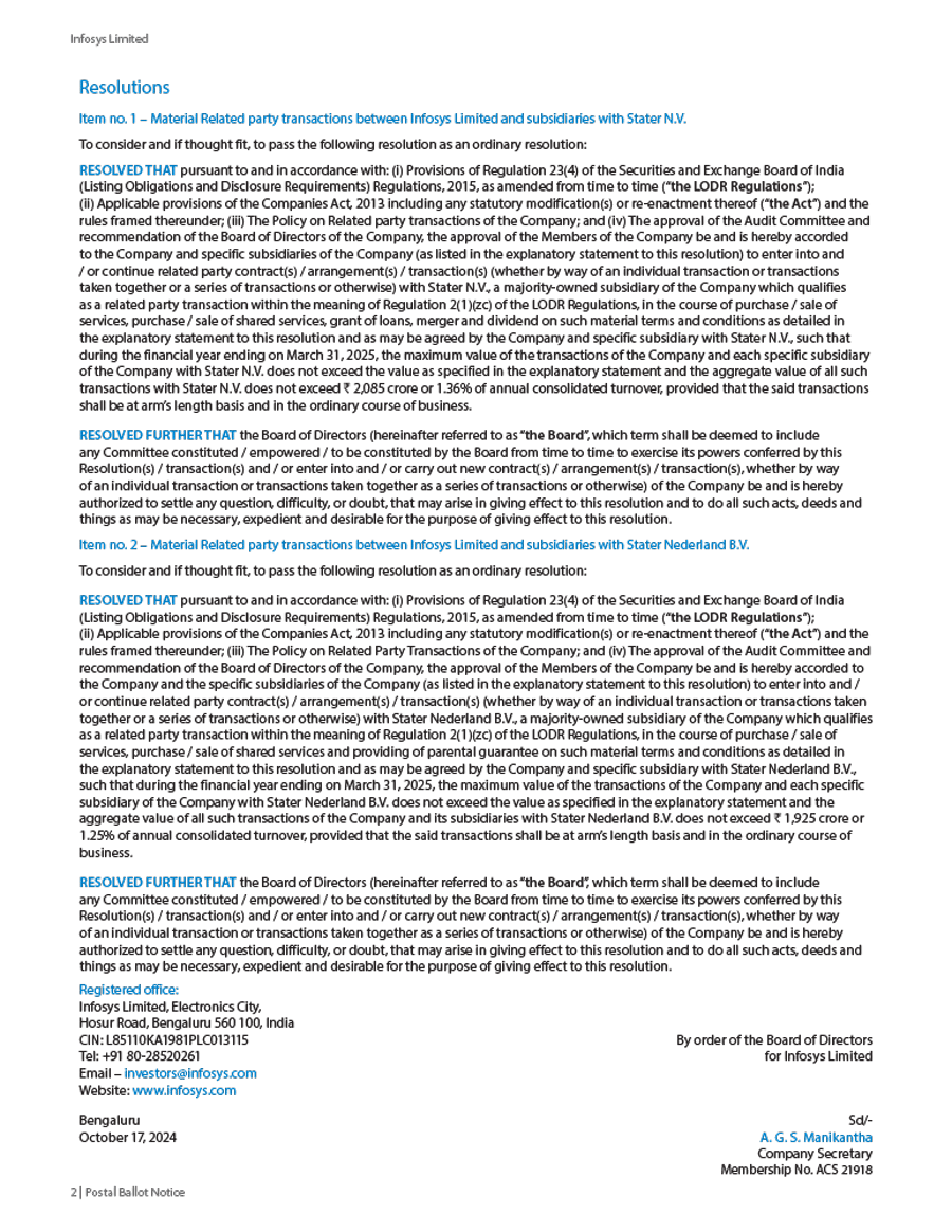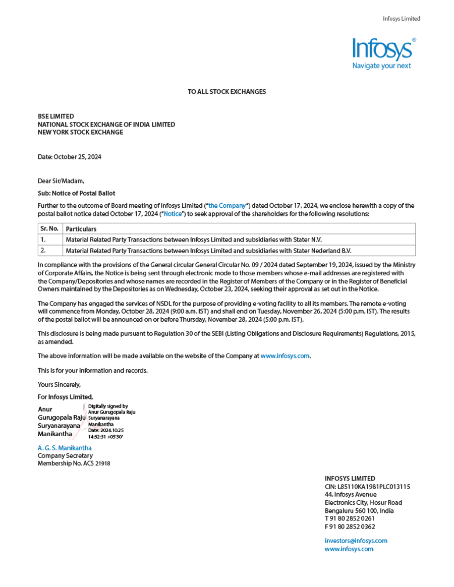 Infosys Limited, a company organized under the laws of the Republic of India ("Infosys", or the "Company"), hereby furnishes with the United States Securities and Exchange Commission this Report on Form 6-K regarding the intimation dated October 25, 2024, pertaining to postal ballot notice to seek approval of the shareholders for the following resolutions;