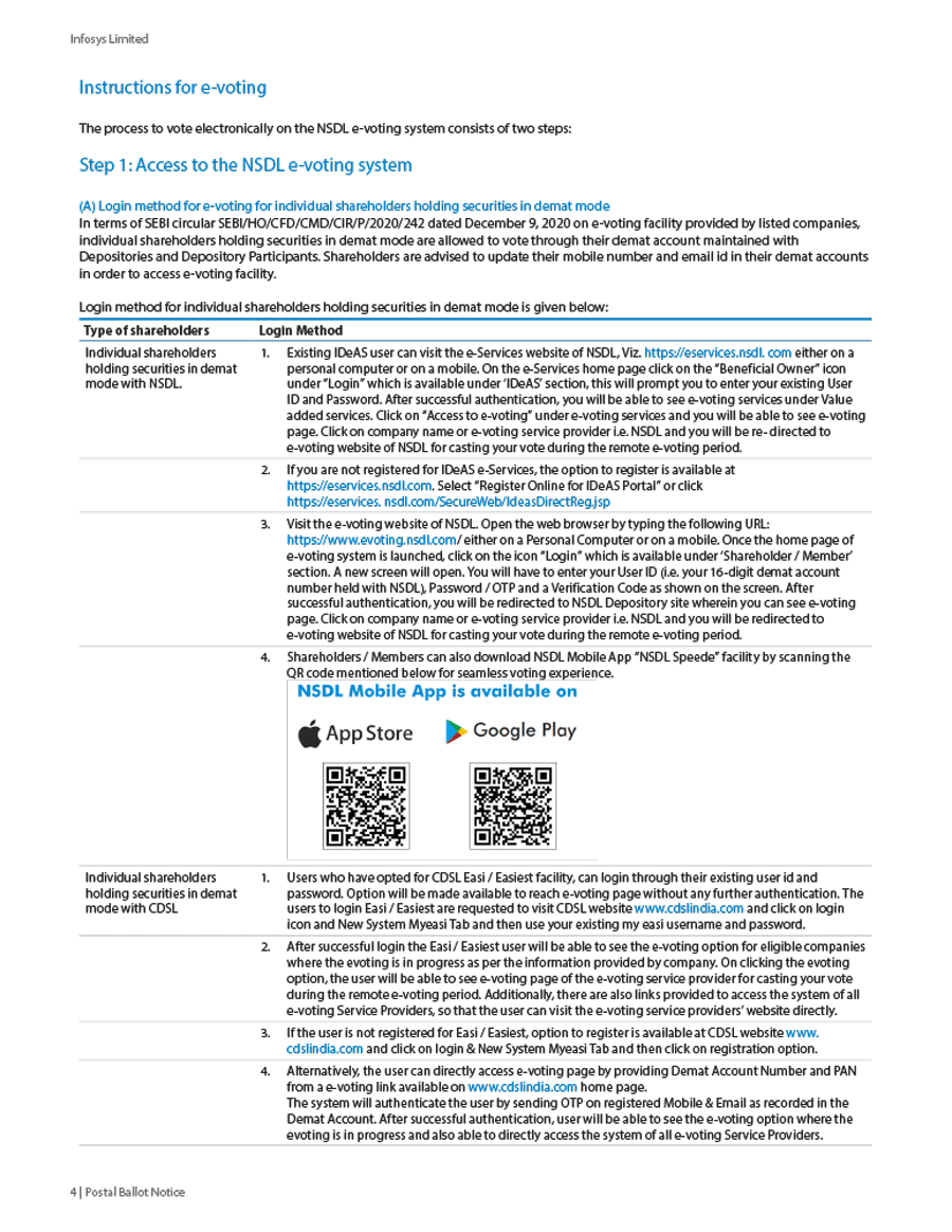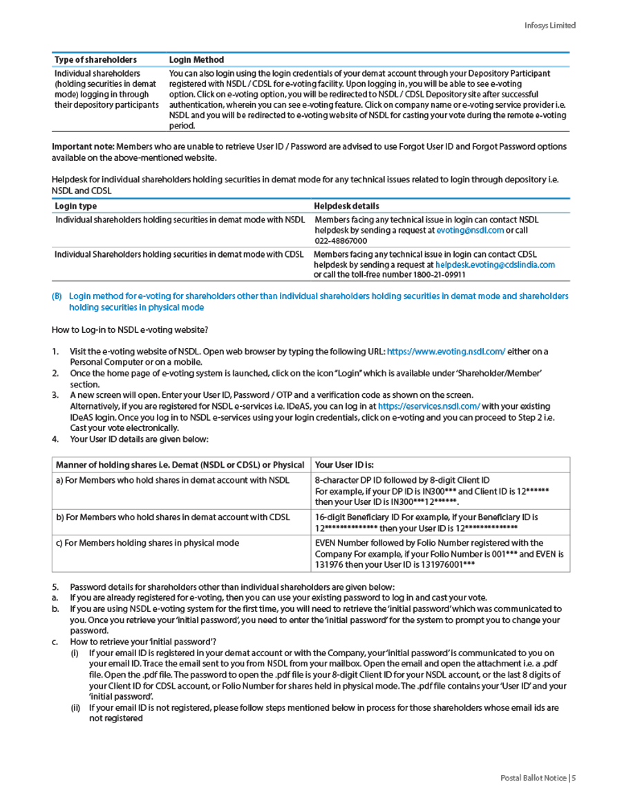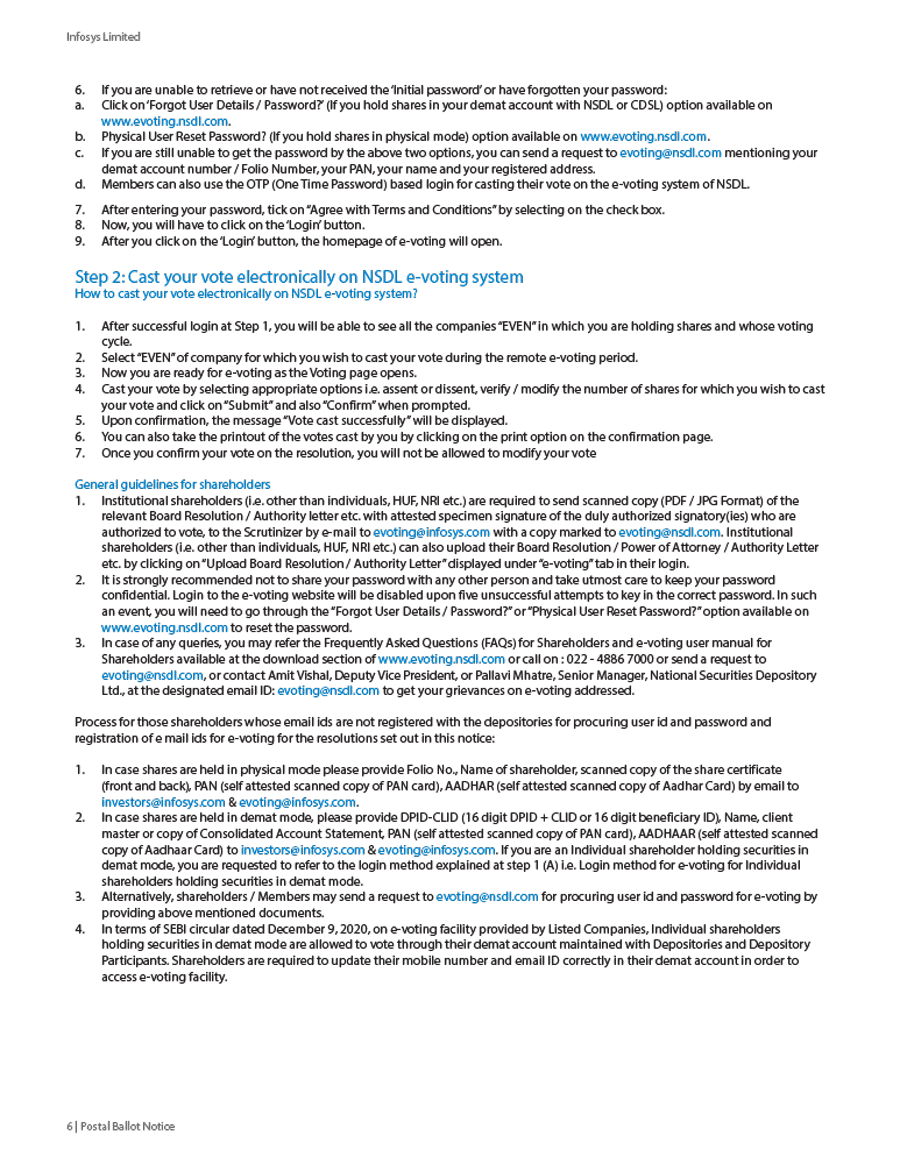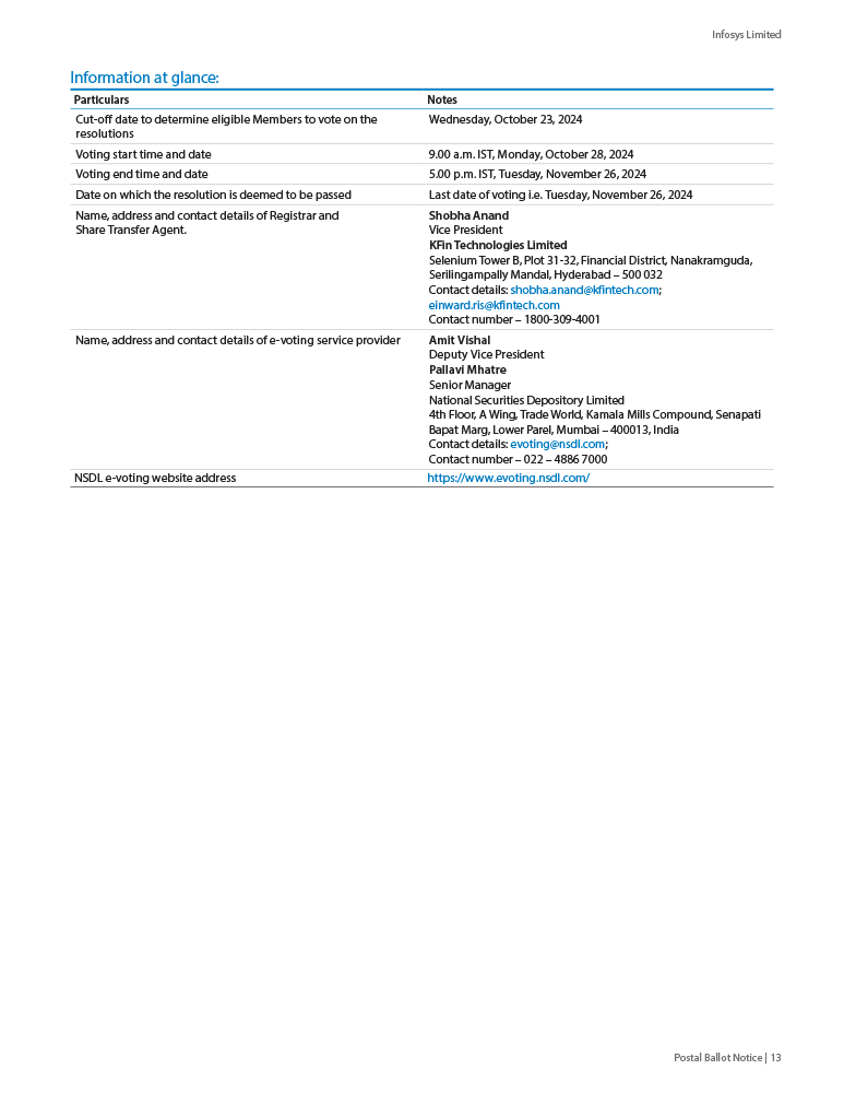 Infosys Limited, a company organized under the laws of the Republic of India ("Infosys", or the "Company"), hereby furnishes with the United States Securities and Exchange Commission this Report on Form 6-K regarding the intimation dated October 25, 2024, pertaining to postal ballot notice to seek approval of the shareholders for the following resolutions;