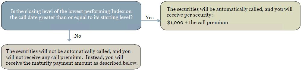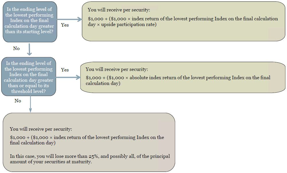 | § | You are willing and able to accept the risk that, if the securities are not automatically called and the ending level of the lowest performing Index on the final calculation day is less than its threshold level, you will lose more than 25%, and possibly all, of the principal amount of your securities at maturity. |
