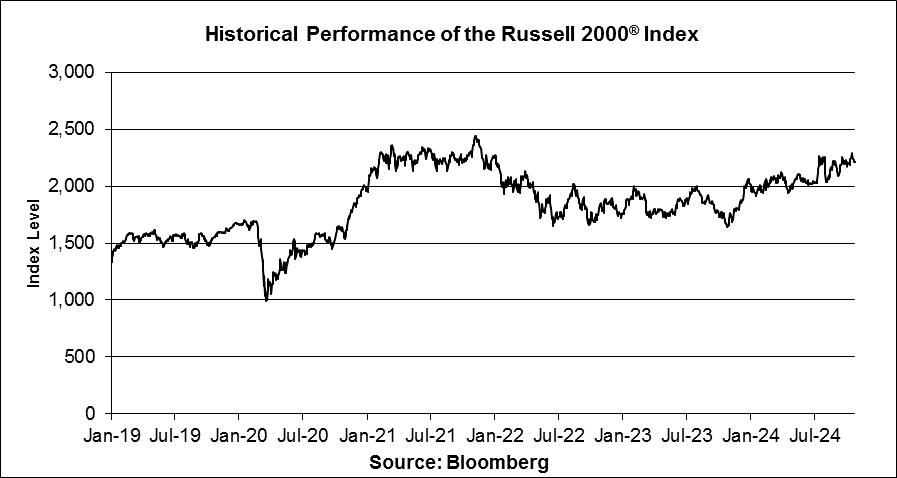 The following graph sets forth the historical performance of the Russell 2000® Index based on the daily historical closing levels of the Russell 2000® Index from January 2, 2019 through October 25, 2024. The closing level of the Russell 2000® Index on October 25, 2024 was 2,207.995. We obtained the closing levels above and below from the Bloomberg Professional® service (“Bloomberg”), without independent verification.
