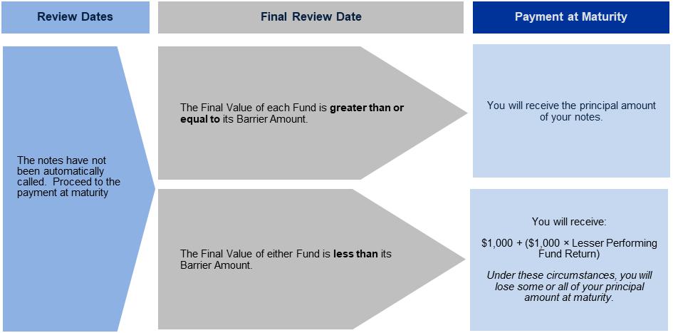 If the closing price of one share of each Fund on any Review Date is greater than or equal to the applicable Call Value, the notes will be automatically called for a cash payment, for each $1,000 principal amount note, equal to (a) $1,000 plus (b) the Call Premium Amount applicable to that Review Date, payable on the applicable Call Settlement Date. No further payments will be made on the notes.