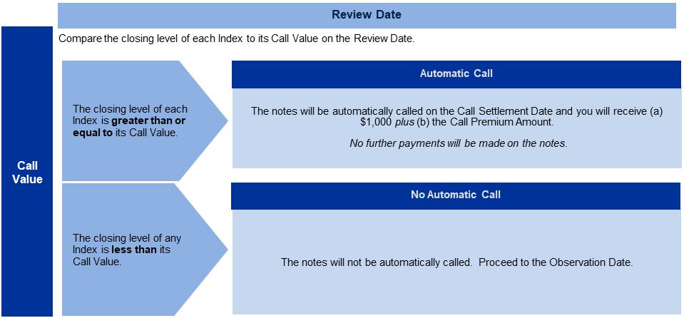 If the closing level of each Index on the Review Date is greater than or equal to its Call Value, the notes will be automatically called for a cash payment, for each $1,000 principal amount note, equal to (a) $1,000 plus (b) the Call Premium Amount, payable on the Call Settlement Date. No further payments will be made on the notes.