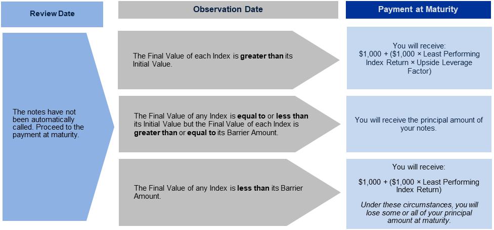 If the closing level of each Index on the Review Date is greater than or equal to its Call Value, the notes will be automatically called and investors will receive on the Call Settlement Date the $1,000 principal amount plus the Call Premium Amount of $120.00. No further payments will be made on the notes.