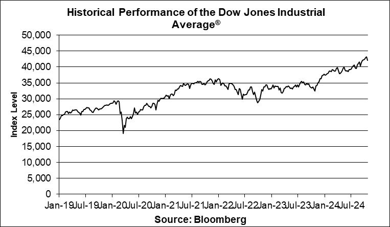 The following graphs set forth the historical performance of each Index based on the weekly historical closing levels from January 4, 2019 through October 25, 2024. The closing level of the Dow Jones Industrial Average® on October 25, 2024 was 42,114.40. The closing level of the Russell 2000® Index on October 25, 2024 was 2,207.995. The closing level of the Nasdaq-100 Index® on October 25, 2024 was 20,352.02. We obtained the closing levels above and below from the Bloomberg Professional® service (“Bloomberg”), without independent verification.