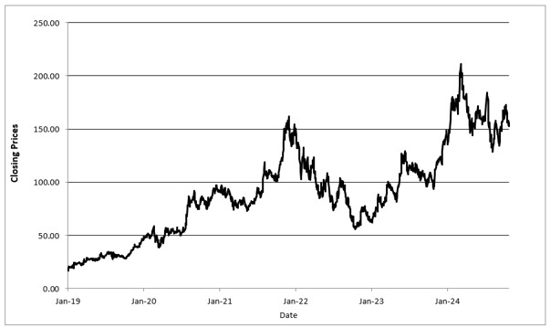 The following graph sets forth daily closing prices of the Underlying Stock for the period from January 1, 2019 to October 25, 2024. The closing price on October 25, 2024 was $156.23. The historical performance of the Underlying Stock should not be taken as an indication of its future performance during the term of the securities.