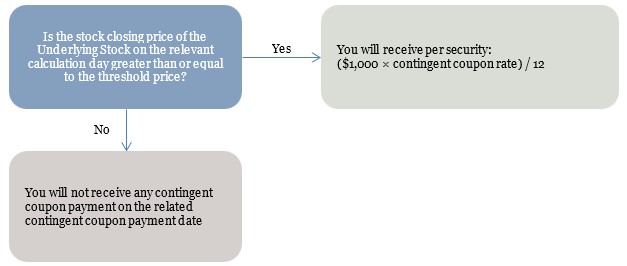 On each contingent coupon payment date, you will receive a contingent coupon payment at a per annum rate equal to the contingent coupon rate if, and only if, the stock closing price of the Underlying Stock on the related calculation day is greater than or equal to the threshold price. Each “contingent coupon payment,” if any, will be calculated per security as follows: ($1,000 × contingent coupon rate)/12. Any contingent coupon payment will be rounded to the nearest cent, with one-half cent rounded upward.