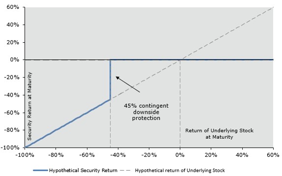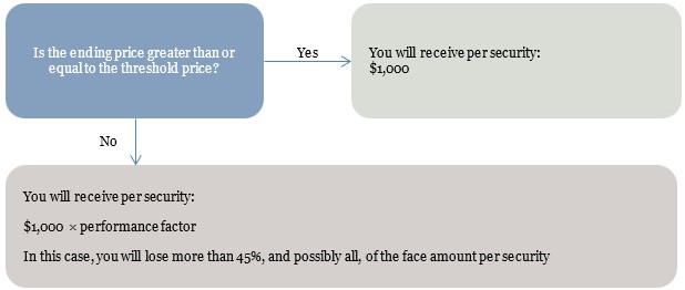 Since the hypothetical ending price is less than the hypothetical starting price, but not by more than 45%, you would receive the face amount of your securities at maturity.