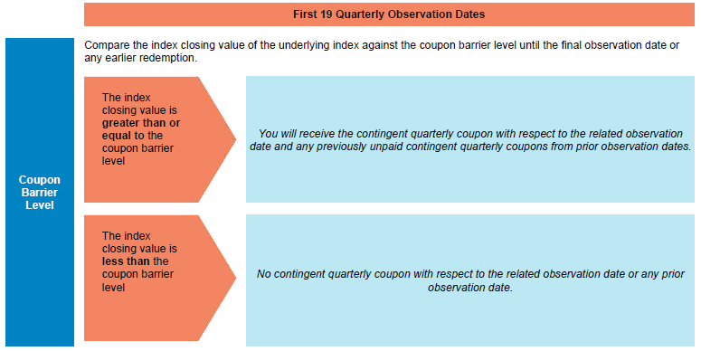 If, on any observation date, the index closing value or the final index value, as applicable, is greater than or equal to the coupon barrier level, we will pay a contingent quarterly coupon at an annual rate of 12.00% to 14.00% (corresponding to approximately $30.00 to $35.00 per quarter per security, to be determined on the pricing date) on the related coupon payment date plus any previously unpaid contingent quarterly coupons from prior observation dates.