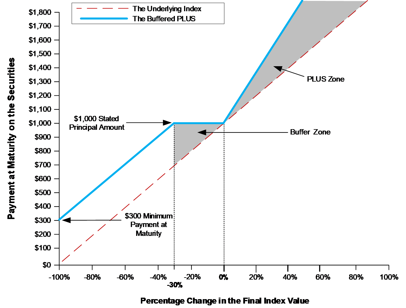 If the final index value is greater than the initial index value: $1,000 + leveraged upside payment If the final index value is less than or equal to the initial index value but has decreased from the initial index value by an amount less than or equal to the buffer amount of 30%: $1,000 If the final index value is less than the initial index value and has decreased from the initial index value by an amount greater than the buffer amount of 30%: ($1,000 × the index performance factor) + $300 Under these circumstances, the payment at maturity will be less than the stated principal amount of $1,000. However, under no circumstances will the Buffered PLUS pay less than $300 per Buffered PLUS at maturity. |