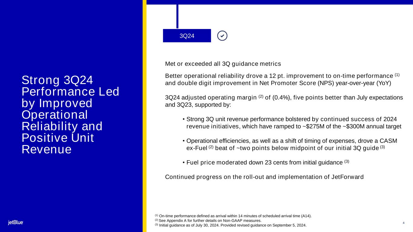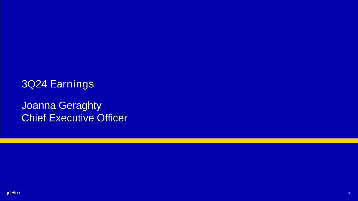 2 Safe Harbor This Presentation contains forward-looking statements within the meaning of the Private Securities Litigation Reform Act of 1995, as amended. We intend such forward-looking statements to be covered by the safe harbor provisions for forward-looking statements contained in Section 27A of the Securities Act of 1933, as amended, and Section 21E of the Securities Exchange Act of 1934, as amended. All statements other than statements of historical facts contained in this Presentation are forward-looking statements. In some cases, you can identify forward-looking statements by terms such as “expects,” “plans,” “intends,” “anticipates,” “indicates,” “remains,” “believes,” “estimates,” “forecast,” “guidance,” “outlook,” “may,” “will,” “should,” “seeks,” “goals,” “targets” or the negative of these terms or other similar expressions. Additionally, forward-looking statements include statements that do not relate solely to historical facts, such as statements which identify uncertainties or trends, discuss the possible future effects of current known trends or uncertainties, or which indicate that the future effects of known trends or uncertainties cannot be predicted, guaranteed, or assured. Forward-looking statements contained in this Presentation include, without limitation, statements regarding our outlook and future results of operations and financial position, including our expected return to profitability, expectations with respect to our headwinds, our product offerings, and our business strategy and plans and objectives for future operations, including JetForward initiatives. Forward-looking statements involve risks, uncertainties and assumptions, and are based on information currently available to us. Actual results may differ materially from those expressed in the forward-looking statements due to many factors, including, without limitation, the risk associated with the execution of our strategic operating plans in the near-term and long-term; our extremely competitive industry; risks related to the long-term nature of our fleet order book; volatility in fuel prices and availability of fuel; increased maintenance costs associated with fleet age; costs associated with salaries, wages and benefits; risks associated with a potential material reduction in the rate of interchange reimbursement fees; risks associated with doing business internationally; our reliance on high daily aircraft utilization; our dependence on the New York metropolitan market; risks associated with extended interruptions or disruptions in service at our focus cities; risks associated with airport expenses; risks associated with seasonality and weather; our reliance on a limited number of suppliers for our aircraft, engines, and our Fly-Fi® product; risks related to new or increased tariffs imposed on commercial aircraft and related parts imported from outside the United States; the outcome of legal proceedings with respect to the NEA and our wind-down of the NEA; risks associated with cybersecurity and privacy, including information security breaches; heightened regulatory requirements concerning data security compliance; risks associated with reliance on, and potential failure of, automated systems to operate our business; our inability to attract and retain qualified crewmembers; our being subject to potential unionization, work stoppages, slowdowns or increased labor costs; reputational and business risk from an accident or incident involving our aircraft; risks associated with damage to our reputation and the JetBlue brand name; our significant amount of fixed obligations and the ability to service such obligations; our substantial indebtedness and impact on our ability to meet future financing needs; financial risks associated with credit card processors; risks associated with seeking short-term additional financing liquidity; failure to realize the full value of intangible or long-lived assets, causing us to record impairments; risks associated with disease outbreaks or environmental disasters affecting travel behavior; compliance with environmental laws and regulations, which may cause us to incur substantial costs; the impacts of federal budget constraints or federally imposed furloughs; impact of global climate change and legal, regulatory or market response to such change; increasing attention to, and evolving expectations regarding, environmental, social and governance matters; changes in government regulations in our industry; acts of war or terrorism; and changes in global economic conditions or an economic downturn leading to a continuing or accelerated decrease in demand for air travel. It is routine for our internal projections and expectations to change as the year or each quarter in the year progresses, and therefore it should be clearly understood that the internal projections, beliefs, and assumptions upon which we base our expectations may change prior to the end of each quarter or year. Given the risks and uncertainties surrounding forward-looking statements, you should not place undue reliance on these statements. You should understand that many important factors, in addition to those discussed or incorporated by reference in this Presentation, could cause our results to differ materially from those expressed in the forward-looking statements. Further information concerning these and other factors is contained in JetBlue's filings with the U.S. Securities and Exchange Commission (the “SEC”), including but not limited to in our Annual Report on Form 10-K for the year ended December 31, 2023, as may be updated by our other SEC filings. In light of these risks and uncertainties, the forward-looking events discussed in this presentation might not occur. Our forward-looking statements speak only as of the date of this Presentation. Other than as required by law, we undertake no obligation to update or revise forward-
