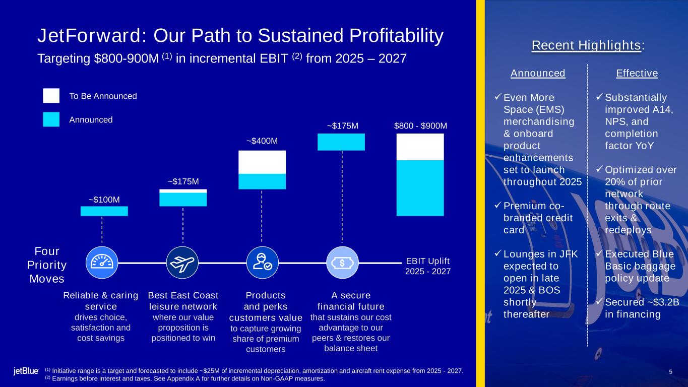 4 Strong 3Q24 Performance Led by Improved Operational Reliability and Positive Unit Revenue Met or exceeded all 3Q guidance metrics Better operational reliability drove a 12 pt. improvement to on-time performance (1) and double digit improvement in Net Promoter Score (NPS) year-over-year (YoY) 3Q24 adjusted operating margin (2) of (0.4%), five points better than July expectations and 3Q23, supported by: • Strong 3Q unit revenue performance bolstered by continued success of 2024 revenue initiatives, which have ramped to ~$275M of the ~$300M annual target • Operational efficiencies, as well as a shift of timing of expenses, drove a CASM ex-Fuel (2) beat of ~two points below midpoint of our initial 3Q guide (3) • Fuel price moderated down 23 cents from initial guidance (3) Continued progress on the roll-out and implementation of JetForward 3Q24 (1) On-time performance defined as arrival within 14 minutes of scheduled arrival time (A14). (2) See Appendix A for further details on Non-GAAP measures. (3) Initial guidance as of July 30, 2024. Provided revised guidance on September 5, 2024.