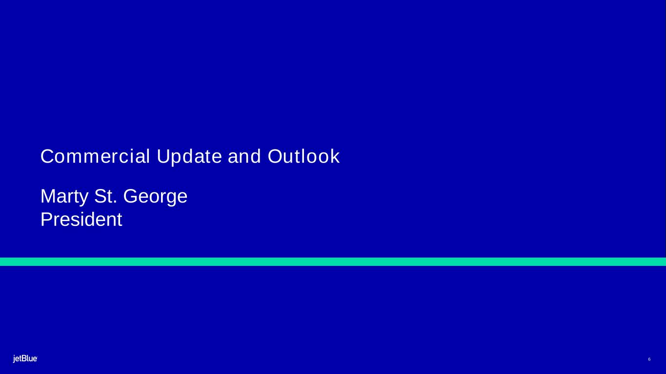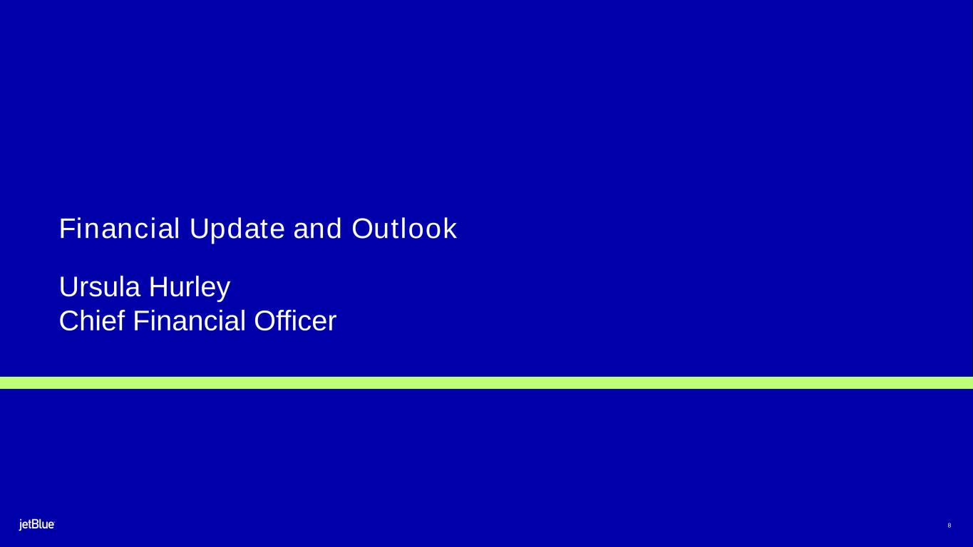This Investor Update contains forward-looking statements within the meaning of the Private Securities Litigation Reform Act of 1995, as amended. We intend such forward-looking statements to be covered by the safe harbor provisions for forward-looking statements contained in Section 27A of the Securities Act of 1933, as amended (the "Securities Act"), and Section 21E of the Securities Exchange Act of 1934, as amended (the "Exchange Act"). All statements other than statements of historical facts contained in this Investor Update are forward-looking statements. In some cases, you can identify forward-looking statements by terms such as "expects," "plans," "intends," "anticipates," "indicates," "remains," "believes," "estimates," "forecast," "guidance," "outlook," "may," "will," "should," "seeks," "goals," "targets" or the negative of these terms or other similar expressions. Additionally, forward-looking statements include statements that do not relate solely to historical facts, such as statements which identify uncertainties or trends, discuss the possible future effects of current known trends or uncertainties, or which indicate that the future effects of known trends or uncertainties cannot be predicted, guaranteed, or assured. Forward-looking statements contained in this Investor Update include, without limitation, statements regarding our outlook and future results of operations and financial position, our order book and related assumptions, and our aircraft return schedule. Forward-looking statements involve risks, uncertainties and assumptions, and are based on information currently available to us. Actual results may differ materially from those expressed in the forward-looking statements due to many factors, including, without limitation, the risk associated with the execution of our strategic operating plans in the near-term and long-term; our extremely competitive industry; risks related to the long-term nature of our fleet order book; volatility in fuel prices and availability of fuel; increased maintenance costs associated with fleet age; costs associated with salaries, wages and benefits; risks associated with a potential material reduction in the rate of interchange reimbursement fees; risks associated with doing business internationally; our reliance on high daily aircraft utilization; our dependence on the New York metropolitan market; risks associated with extended interruptions or disruptions in service at our focus cities; risks associated with airport expenses; risks associated with seasonality and weather; our reliance on a limited number of suppliers for our aircraft, engines, and our Fly-Fi® product; risks related to new or increased tariffs imposed on commercial aircraft and related parts imported from outside the United States; the outcome of legal proceedings with respect to the NEA and our wind-down of the NEA; risks associated with cybersecurity and privacy, including information security breaches; heightened regulatory requirements concerning data security compliance; risks associated with reliance on, and potential failure of, automated systems to operate our business; our inability to attract and retain qualified crewmembers; our being subject to potential unionization, work stoppages, slowdowns or increased labor costs; reputational and business risk from an accident or incident involving our aircraft; risks associated with damage to our reputation and the JetBlue brand name; our significant amount of fixed obligations and the ability to service such obligations; our substantial indebtedness and impact on our ability to meet future financing needs; financial risks associated with credit card processors; risks associated with seeking short-term additional financing liquidity; failure to realize the full value of intangible or long-lived assets, causing us to record impairments; risks associated with disease outbreaks or environmental disasters affecting travel behavior; compliance with environmental laws and regulations, which may cause us to incur substantial costs; the impacts of federal budget constraints or federally imposed furloughs; impact of global climate change and legal, regulatory or market response to such change; increasing attention to, and evolving expectations regarding, environmental, social and governance matters; changes in government regulations in our industry; acts of war or terrorism; and changes in global economic conditions or an economic downturn leading to a continuing or accelerated decrease in demand for air travel. It is routine for our internal projections and expectations to change as the year or each quarter in the year progresses, and therefore it should be clearly understood that the internal projections, beliefs, and assumptions upon which we base our expectations may change prior to the end of each quarter or year.