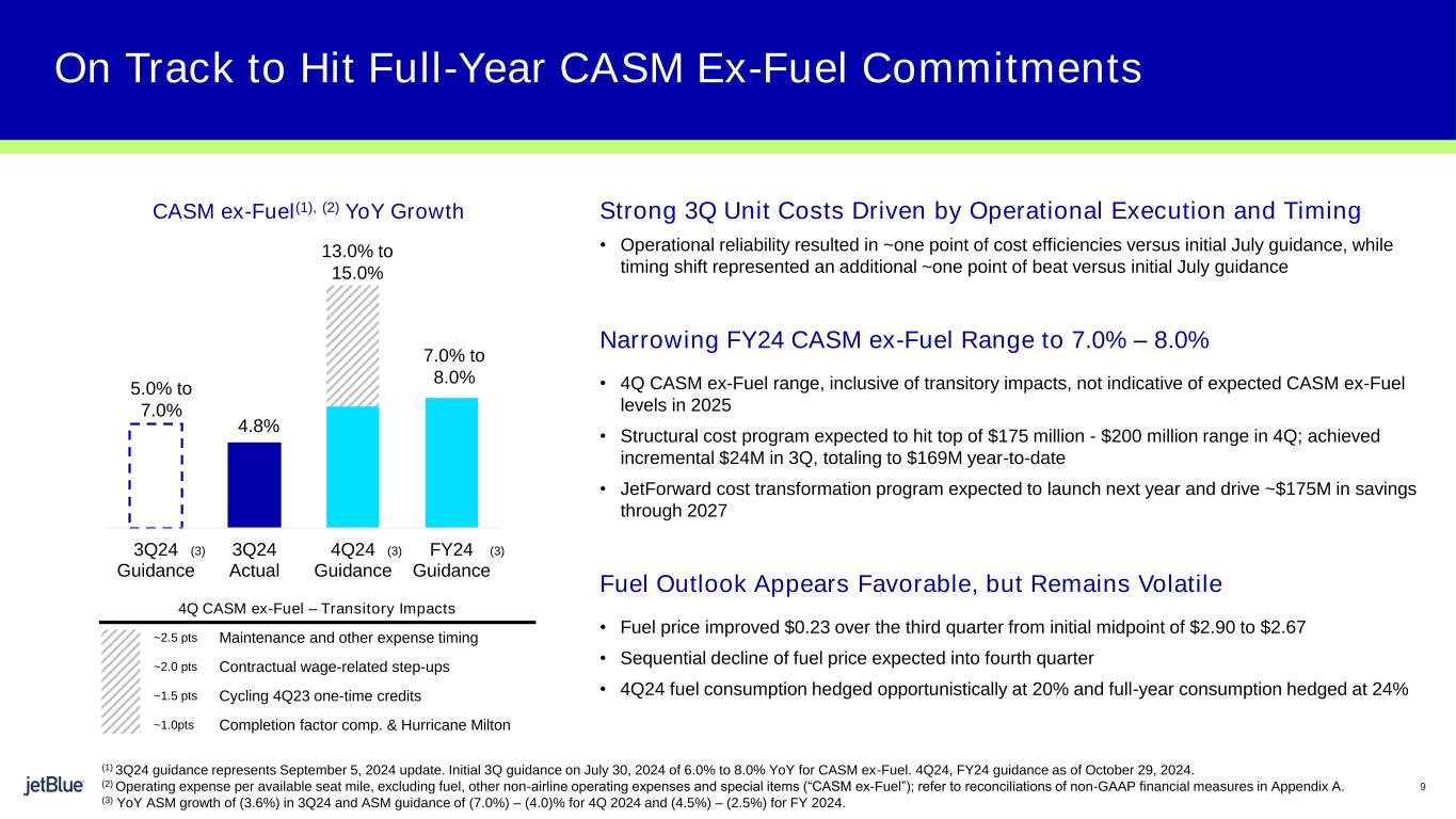 15 Operating expense per available seat mile, excluding fuel, other non-airline operating expenses, and special items (“CASM Ex- Fuel”) Operating Expense per Available Seat Mile (“CASM”) is a common metric used in the airline industry. Our CASM for the relevant periods are summarized in the table below. We exclude aircraft fuel, operating expenses related to other non-airline businesses, such as JetBlue Technology Ventures and JetBlue Travel Products, and special items from total operating expenses to determine Operating Expenses ex-fuel, which is a non-GAAP financial measure, and we exclude the same items from CASM to determine CASM ex-fuel, which is also a non-GAAP financial measure. We believe the impact of these special items distorts our overall trends and that our metrics are more comparable with the presentation of our results excluding such impact. We believe that Operating Expenses ex-fuel and CASM ex-fuel are useful for investors because they provide investors the ability to measure our financial performance excluding items that are beyond our control, such as fuel costs, which are subject to many economic and political factors, as well as items that are not related to the generation of an available seat mile, such as operating expense related to certain non-airline businesses and special items. We believe these non-GAAP measures are more indicative of our ability to manage airline costs and are more comparable to measures reported by other major airlines. For the three months ended September 30, 2024, special items included union contract costs and voluntary opt-out costs. For the nine months ended September 30, 2024, special items included Spirit-related costs, union contract costs, voluntary opt-out costs, and Embraer E190 fleet transition costs. For the three and nine months ended September 30, 2023, special items included Spirit-related costs and union contract costs. The table below provides a reconciliation of our total operating expenses (GAAP measure) to Operating Expenses ex-fuel, and our CASM to CASM ex-fuel for the periods presented. NON-GAAP FINANCIAL MEASURE RECONCILIATION OF OPERATING EXPENSE AND OPERATING EXPENSE PER ASM (CASM), EXCLUDING FUEL (unaudited) Three Months Ended September 30, Nine Months Ended September 30, $ Cents per ASM $ Cents per ASM ($ in millions; per ASM data in cents; percent changes based on unrounded numbers) 2024 2023 Percent Change 2024 2023 Percent Change 2024 2023 Percent Change 2024 2023 Percent Change Total operating expenses $ 2,403 $ 2,509 (4.2) 14.35 14.45 (0.7) $ 7,702 $ 7,453 3.4 15.42 14.48 6.5 Less: Aircraft fuel 584 701 (16.8) 3.49 4.04 (13.7) 1,835 2,108 (12.9) 3.67 4.09 (10.3) Other non-airline expenses 14 16 (10.7) 0.08 0.09 (7.4) 46 49 (5.7) 0.09 0.09 (2.8) Special items 27 33 (17.3) 0.16 0.19 (14.3) 590 168 NM (1) 1.18 0.33 NM Operating expenses, excluding fuel $ 1,778 $ 1,759 1.1 10.62 10.13 4.8 $ 5,231 $ 5,128 2.0 10.48 9.96 5.2 (1) Not meaningful or greater than 100% change.