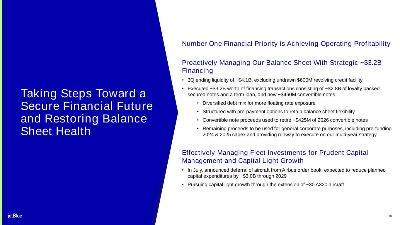 9 3Q24 Guidance 3Q24 Actual 4Q24 Guidance FY24 Guidance 4.8% 13.0% to 15.0% CASM ex-Fuel(1), (2) YoY Growth On Track to Hit Full-Year CASM Ex-Fuel Commitments (1) 3Q24 guidance represents September 5, 2024 update. Initial 3Q guidance on July 30, 2024 of 6.0% to 8.0% YoY for CASM ex-Fuel. 4Q24, FY24 guidance as of October 29, 2024. (2) Operating expense per available seat mile, excluding fuel, other non-airline operating expenses and special items (“CASM ex-Fuel”); refer to reconciliations of non-GAAP financial measures in Appendix A. (3) YoY ASM growth of (3.6%) in 3Q24 and ASM guidance of (7.0%) – (4.0)% for 4Q 2024 and (4.5%) – (2.5%) for FY 2024. 5.0% to 7.0% Strong 3Q Unit Costs Driven by Operational Execution and Timing • Operational reliability resulted in ~one point of cost efficiencies versus initial July guidance, while timing shift represented an additional ~one point of beat versus initial July guidance Narrowing FY24 CASM ex-Fuel Range to 7.0% – 8.0% • 4Q CASM ex-Fuel range, inclusive of transitory impacts, not indicative of expected CASM ex-Fuel levels in 2025 • Structural cost program expected to hit top of $175 million - $200 million range in 4Q; achieved incremental $24M in 3Q, totaling to $169M year-to-date • JetForward cost transformation program expected to launch next year and drive ~$175M in savings through 2027 Fuel Outlook Appears Favorable, but Remains Volatile • Fuel price improved $0.23 over the third quarter from initial midpoint of $2.90 to $2.67 • Sequential decline of fuel price expected into fourth quarter • 4Q24 fuel consumption hedged opportunistically at 20% and full-year consumption hedged at 24% (3) (3) (3) 7.0% to 8.0% 4Q CASM ex-Fuel – Transitory Impacts ~2.5 pts Maintenance and other expense timing ~2.0 pts Contractual wage-related step-ups ~1.5 pts Cycling 4Q23 one-time credits ~1.0pts Completion factor comp. & Hurricane Milton