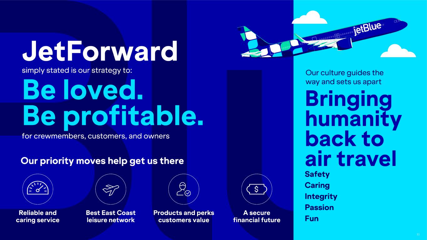10 Taking Steps Toward a Secure Financial Future and Restoring Balance Sheet Health Number One Financial Priority is Achieving Operating Profitability Proactively Managing Our Balance Sheet With Strategic ~$3.2B Financing • 3Q ending liquidity of ~$4.1B, excluding undrawn $600M revolving credit facility • Executed ~$3.2B worth of financing transactions consisting of ~$2.8B of loyalty backed secured notes and a term loan, and new ~$460M convertible notes • Diversified debt mix for more floating rate exposure • Structured with pre-payment options to retain balance sheet flexibility • Convertible note proceeds used to retire ~$425M of 2026 convertible notes • Remaining proceeds to be used for general corporate purposes, including pre-funding 2024 & 2025 capex and providing runway to execute on our multi-year strategy Effectively Managing Fleet Investments for Prudent Capital Management and Capital Light Growth • In July, announced deferral of aircraft from Airbus order book, expected to reduce planned capital expenditures by ~$3.0B through 2029 • Pursuing capital light growth through the extension of ~30 A320 aircraft