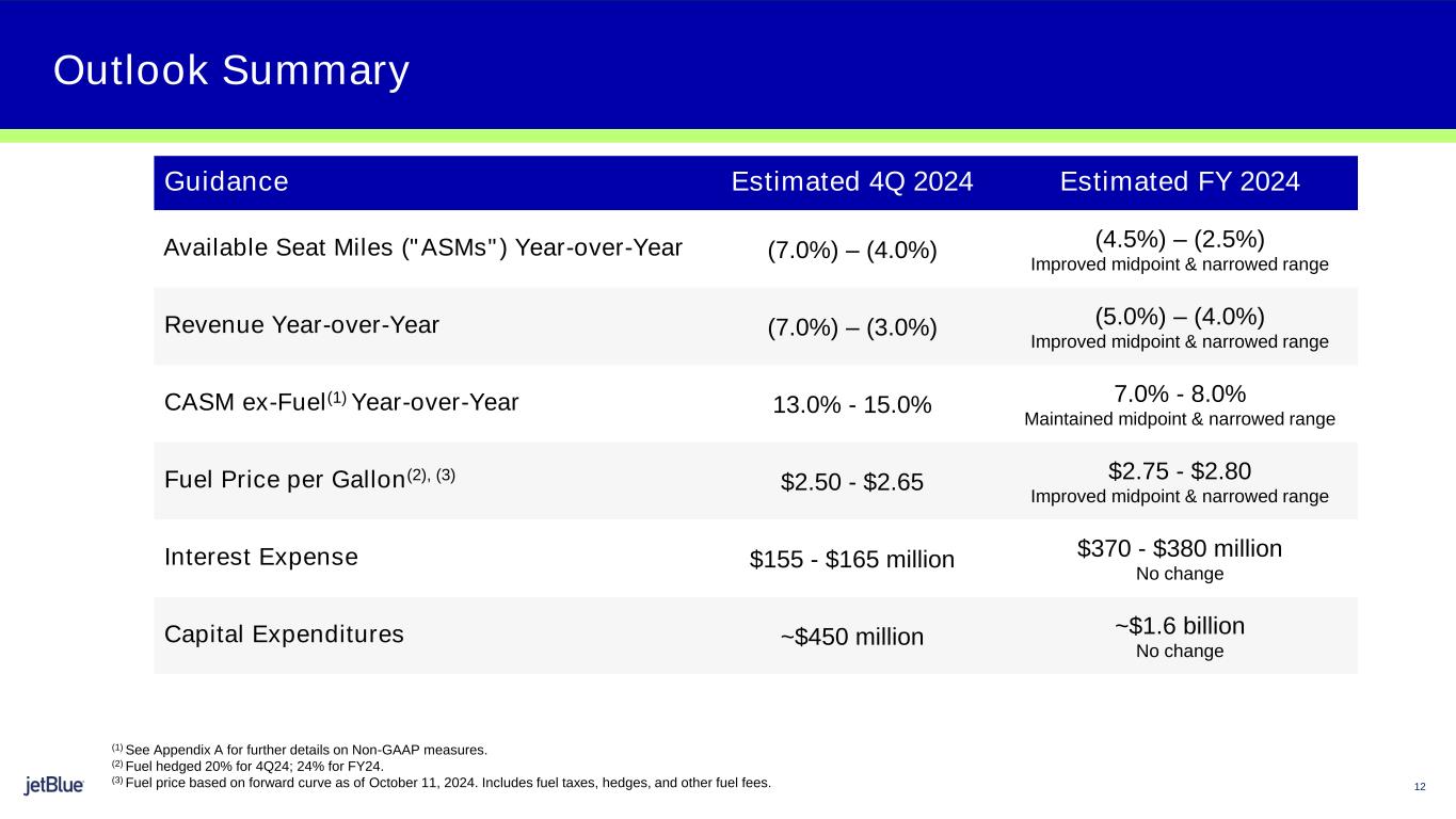 This update provides JetBlue’s investor guidance for the fourth quarter ending December 31, 2024 and full year 2024.