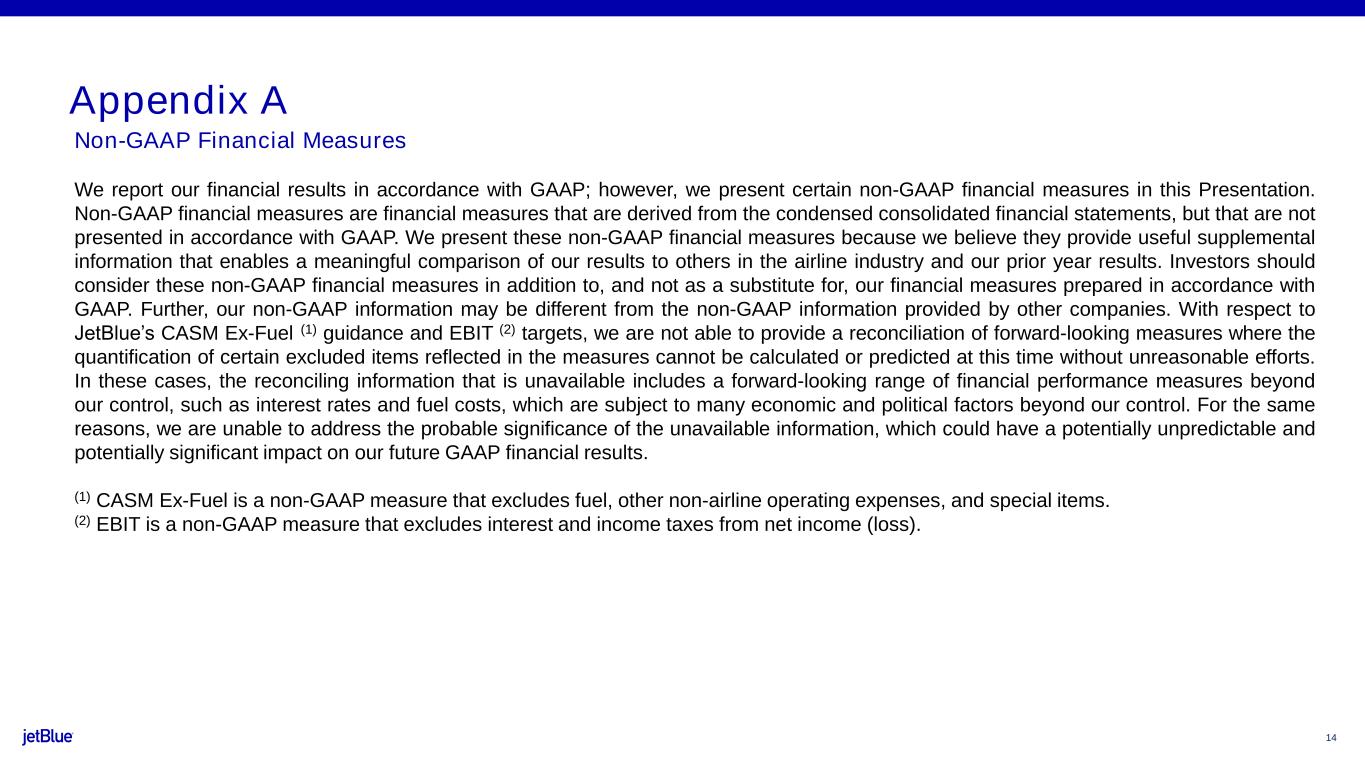 14 Non-GAAP Financial Measures We report our financial results in accordance with GAAP; however, we present certain non-GAAP financial measures in this Presentation. Non-GAAP financial measures are financial measures that are derived from the condensed consolidated financial statements, but that are not presented in accordance with GAAP. We present these non-GAAP financial measures because we believe they provide useful supplemental information that enables a meaningful comparison of our results to others in the airline industry and our prior year results. Investors should consider these non-GAAP financial measures in addition to, and not as a substitute for, our financial measures prepared in accordance with GAAP. Further, our non-GAAP information may be different from the non-GAAP information provided by other companies. With respect to JetBlue’s CASM Ex-Fuel (1) guidance and EBIT (2) targets, we are not able to provide a reconciliation of forward-looking measures where the quantification of certain excluded items reflected in the measures cannot be calculated or predicted at this time without unreasonable efforts. In these cases, the reconciling information that is unavailable includes a forward-looking range of financial performance measures beyond our control, such as interest rates and fuel costs, which are subject to many economic and political factors beyond our control. For the same reasons, we are unable to address the probable significance of the unavailable information, which could have a potentially unpredictable and potentially significant impact on our future GAAP financial results. (1) CASM Ex-Fuel is a non-GAAP measure that excludes fuel, other non-airline operating expenses, and special items. (2) EBIT is a non-GAAP measure that excludes interest and income taxes from net income (loss). Appendix A
