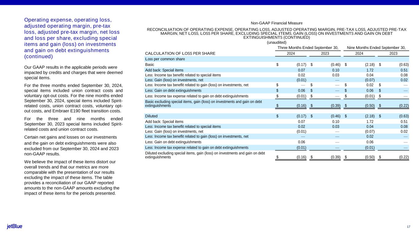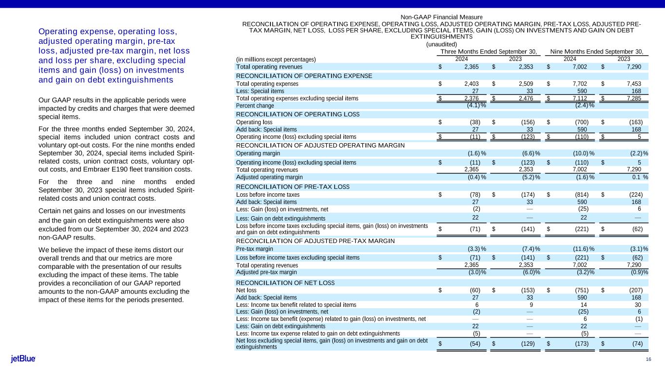 16 Operating expense, operating loss, adjusted operating margin, pre-tax loss, adjusted pre-tax margin, net loss and loss per share, excluding special items and gain (loss) on investments and gain on debt extinguishments Our GAAP results in the applicable periods were impacted by credits and charges that were deemed special items. For the three months ended September 30, 2024, special items included union contract costs and voluntary opt-out costs. For the nine months ended September 30, 2024, special items included Spirit- related costs, union contract costs, voluntary opt- out costs, and Embraer E190 fleet transition costs. For the three and nine months ended September 30, 2023 special items included Spirit- related costs and union contract costs. Certain net gains and losses on our investments and the gain on debt extinguishments were also excluded from our September 30, 2024 and 2023 non-GAAP results. We believe the impact of these items distort our overall trends and that our metrics are more comparable with the presentation of our results excluding the impact of these items. The table provides a reconciliation of our GAAP reported amounts to the non-GAAP amounts excluding the impact of these items for the periods presented. Non-GAAP Financial Measure RECONCILIATION OF OPERATING EXPENSE, OPERATING LOSS, ADJUSTED OPERATING MARGIN, PRE-TAX LOSS, ADJUSTED PRE- TAX MARGIN, NET LOSS, LOSS PER SHARE, EXCLUDING SPECIAL ITEMS, GAIN (LOSS) ON INVESTMENTS AND GAIN ON DEBT EXTINGUISHMENTS (unaudited) Three Months Ended September 30, Nine Months Ended September 30, (in millions except percentages) 2024 2023 2024 2023 Total operating revenues $ 2,365 $ 2,353 $ 7,002 $ 7,290 RECONCILIATION OF OPERATING EXPENSE Total operating expenses $ 2,403 $ 2,509 $ 7,702 $ 7,453 Less: Special items 27 33 590 168 Total operating expenses excluding special items $ 2,376 $ 2,476 $ 7,112 $ 7,285 Percent change (4.1)% (2.4)% RECONCILIATION OF OPERATING LOSS Operating loss $ (38) $ (156) $ (700) $ (163) Add back: Special items 27 33 590 168 Operating income (loss) excluding special items $ (11) $ (123) $ (110) $ 5 RECONCILIATION OF ADJUSTED OPERATING MARGIN Operating margin (1.6) % (6.6)% (10.0) % (2.2)% Operating income (loss) excluding special items $ (11) $ (123) $ (110) $ 5 Total operating revenues 2,365 2,353 7,002 7,290 Adjusted operating margin (0.4) % (5.2)% (1.6) % 0.1 % RECONCILIATION OF PRE-TAX LOSS Loss before income taxes $ (78) $ (174) $ (814) $ (224) Add back: Special items 27 33 590 168 Less: Gain (loss) on investments, net (2) — (25) 6 Less: Gain on debt extinguishments 22 — 22 — Loss before income taxes excluding special items, gain (loss) on investments and gain on debt extinguishments $ (71) $ (141) $ (221) $ (62) RECONCILIATION OF ADJUSTED PRE-TAX MARGIN Pre-tax margin (3.3) % (7.4)% (11.6) % (3.1)% Loss before income taxes excluding special items $ (71) $ (141) $ (221) $ (62) Total operating revenues 2,365 2,353 7,002 7,290 Adjusted pre-tax margin (3.0)% (6.0)% (3.2)% (0.9)% RECONCILIATION OF NET LOSS Net loss $ (60) $ (153) $ (751) $ (207) Add back: Special items 27 33 590 168 Less: Income tax benefit related to special items 6 9 14 30 Less: Gain (loss) on investments, net (2) — (25) 6 Less: Income tax benefit (expense) related to gain (loss) on investments, net — — 6 (1) Less: Gain on debt extinguishments 22 — 22 — Less: Income tax expense related to gain on debt extinguishments (5) — (5) — Net loss excluding special items, gain (loss) on investments and gain on debt extinguishments $ (54) $ (129) $ (173) $ (74)