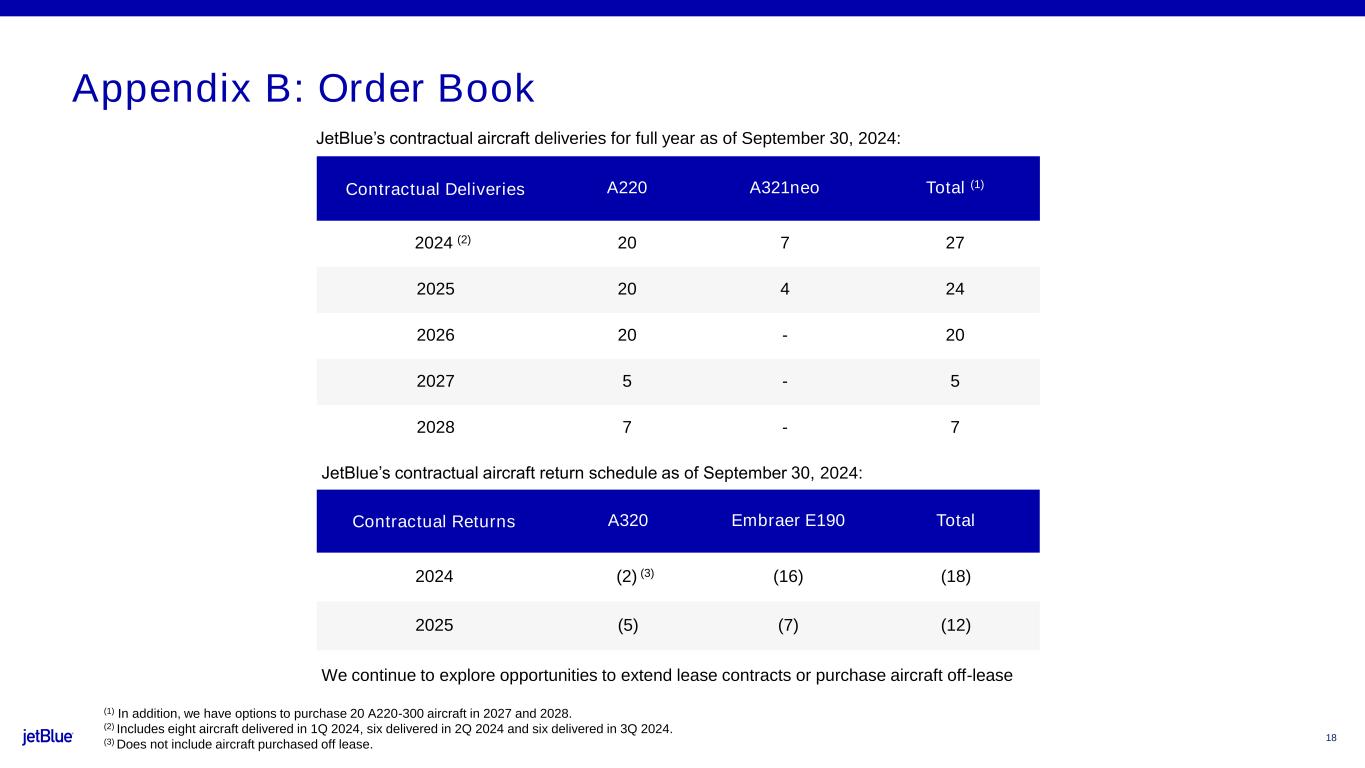 17 Operating expense, operating loss, adjusted operating margin, pre-tax loss, adjusted pre-tax margin, net loss and loss per share, excluding special items and gain (loss) on investments and gain on debt extinguishments (continued) Our GAAP results in the applicable periods were impacted by credits and charges that were deemed special items. For the three months ended September 30, 2024, special items included union contract costs and voluntary opt-out costs. For the nine months ended September 30, 2024, special items included Spirit- related costs, union contract costs, voluntary opt- out costs, and Embraer E190 fleet transition costs. For the three and nine months ended September 30, 2023 special items included Spirit- related costs and union contract costs. Certain net gains and losses on our investments and the gain on debt extinguishments were also excluded from our September 30, 2024 and 2023 non-GAAP results. We believe the impact of these items distort our overall trends and that our metrics are more comparable with the presentation of our results excluding the impact of these items. The table provides a reconciliation of our GAAP reported amounts to the non-GAAP amounts excluding the impact of these items for the periods presented. Non-GAAP Financial Measure RECONCILIATION OF OPERATING EXPENSE, OPERATING LOSS, ADJUSTED OPERATING MARGIN, PRE-TAX LOSS, ADJUSTED PRE-TAX MARGIN, NET LOSS, LOSS PER SHARE, EXCLUDING SPECIAL ITEMS, GAIN (LOSS) ON INVESTMENTS AND GAIN ON DEBT EXTINGUISHMENTS (CONTINUED) (unaudited) Three Months Ended September 30, Nine Months Ended September 30, CALCULATION OF LOSS PER SHARE 2024 2023 2024 2023 Loss per common share Basic $ (0.17) $ (0.46) $ (2.18) $ (0.63) Add back: Special items 0.07 0.10 1.72 0.51 Less: Income tax benefit related to special items 0.02 0.03 0.04 0.08 Less: Gain (loss) on investments, net (0.01) — (0.07) 0.02 Less: Income tax benefit related to gain (loss) on investments, net $ — $ — $ 0.02 $ — Less: Gain on debt extinguishments $ 0.06 $ — $ 0.06 $ — Less: Income tax expense related to gain on debt extinguishments $ (0.01) $ — $ (0.01) $ — Basic excluding special items, gain (loss) on investments and gain on debt extinguishments $ (0.16) $ (0.39) $ (0.50) $ (0.22) Diluted $ (0.17) $ (0.46) $ (2.18) $ (0.63) Add back: Special items 0.07 0.10 1.72 0.51 Less: Income tax benefit related to special items 0.02 0.03 0.04 0.08 Less: Gain (loss) on investments, net (0.01) — (0.07) 0.02 Less: Income tax benefit related to gain (loss) on investments, net — — 0.02 — Less: Gain on debt extinguishments 0.06 — 0.06 — Less: Income tax expense related to gain on debt extinguishments (0.01) — (0.01) — Diluted excluding special items, gain (loss) on investments and gain on debt extinguishments $ (0.16) $ (0.39) $ (0.50) $ (0.22)