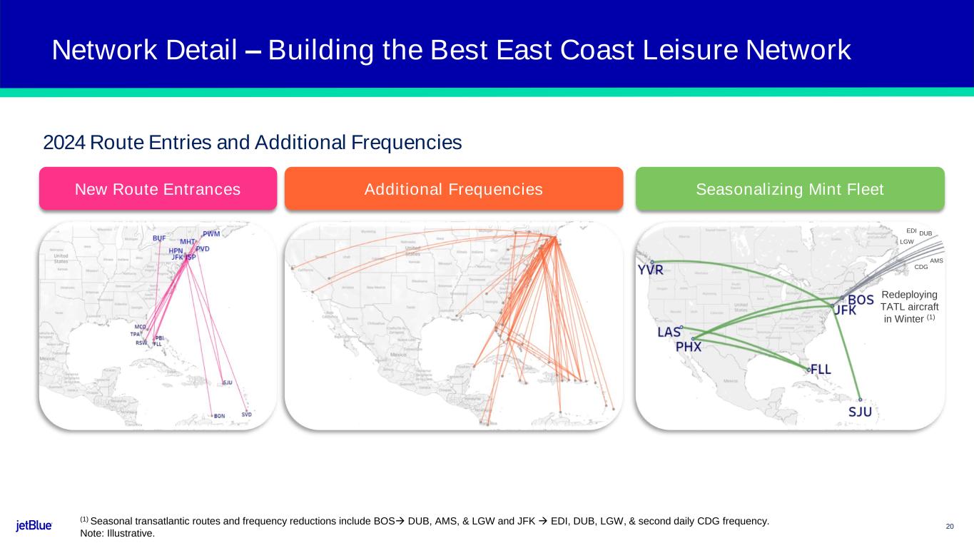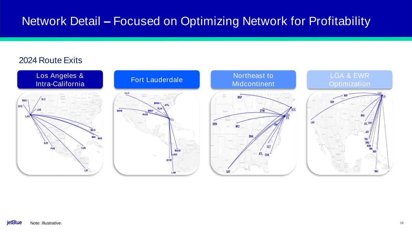 19 Network Detail – Focused on Optimizing Network for Profitability Note: Illustrative. Fort Lauderdale Los Angeles & Intra-California Northeast to Midcontinent LGA & EWR Optimization 2024 Route Exits