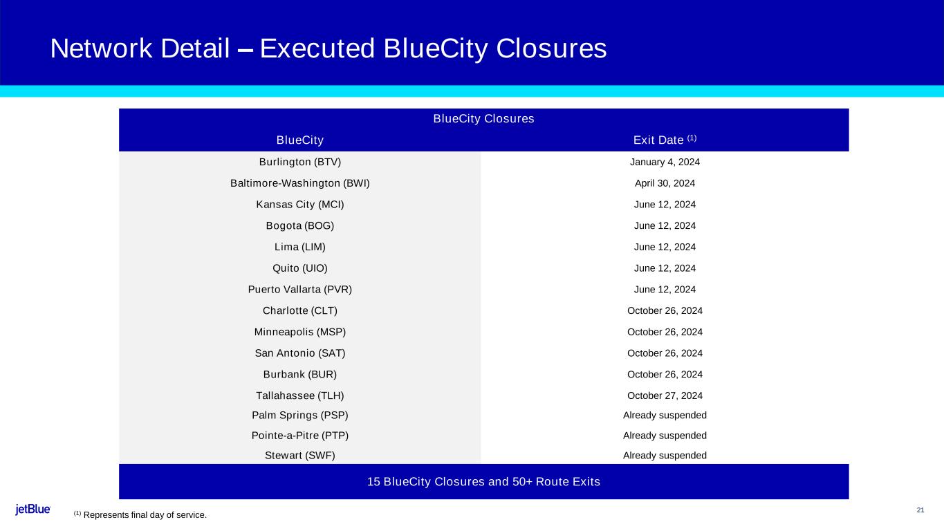 20 Network Detail – Building the Best East Coast Leisure Network (1) Seasonal transatlantic routes and frequency reductions include BOS DUB, AMS, & LGW and JFK EDI, DUB, LGW, & second daily CDG frequency. Note: Illustrative. Additional FrequenciesNew Route Entrances Seasonalizing Mint Fleet Redeploying TATL aircraft in Winter (1) 2024 Route Entries and Additional Frequencies EDI DUB AMS LGW CDG