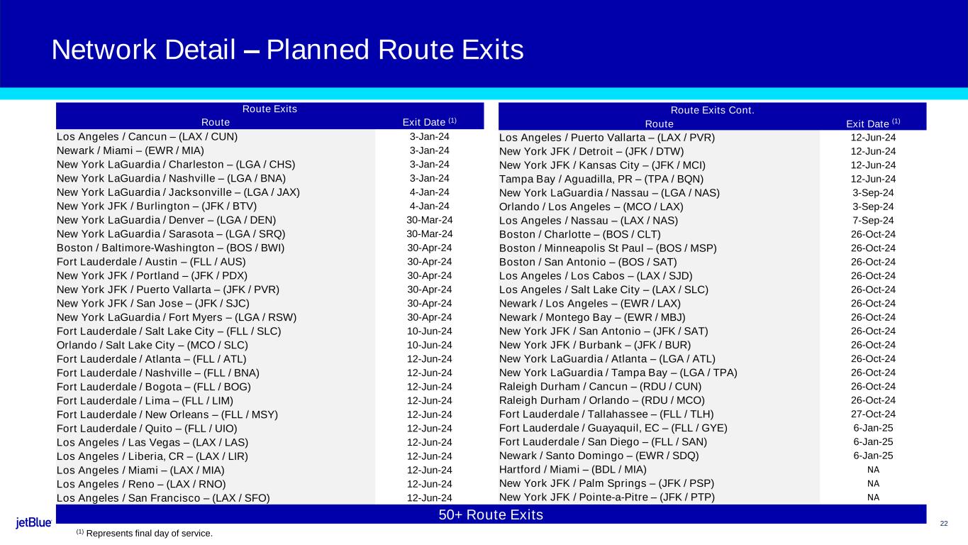 21 Network Detail – Executed BlueCity Closures BlueCity Closures BlueCity Exit Date (1) Burlington (BTV) January 4, 2024 Baltimore-Washington (BWI) April 30, 2024 Kansas City (MCI) June 12, 2024 Bogota (BOG) June 12, 2024 Lima (LIM) June 12, 2024 Quito (UIO) June 12, 2024 Puerto Vallarta (PVR) June 12, 2024 Charlotte (CLT) October 26, 2024 Minneapolis (MSP) October 26, 2024 San Antonio (SAT) October 26, 2024 Burbank (BUR) October 26, 2024 Tallahassee (TLH) October 27, 2024 Palm Springs (PSP) Already suspended Pointe-a-Pitre (PTP) Already suspended Stewart (SWF) Already suspended 15 BlueCity Closures and 50+ Route Exits (1) Represents final day of service.