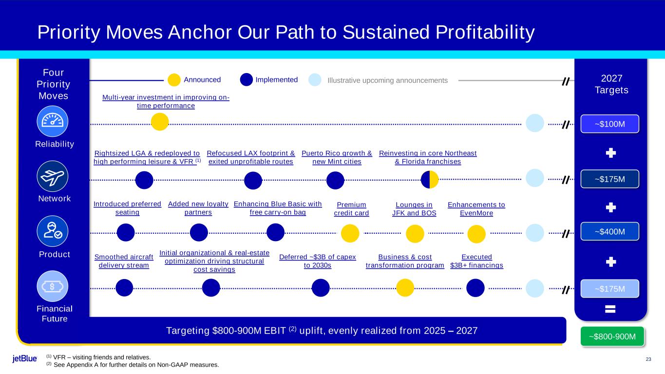 23 Priority Moves Anchor Our Path to Sustained Profitability Product Reliability Financial Future Introduced preferred seating Enhancing Blue Basic with free carry-on bag Added new loyalty partners Four Priority Moves ~$175M ~$400M ~$100M 2027 Targets Smoothed aircraft delivery stream Multi-year investment in improving on- time performance Deferred ~$3B of capex to 2030s Targeting $800-900M EBIT (2) uplift, evenly realized from 2025 – 2027 Initial organizational & real-estate optimization driving structural cost savings Announced Implemented Illustrative upcoming announcements Network Refocused LAX footprint & exited unprofitable routes ~$175M Puerto Rico growth & new Mint cities Rightsized LGA & redeployed to high performing leisure & VFR (1) Reinvesting in core Northeast & Florida franchises Business & cost transformation program (1) VFR – visiting friends and relatives. (2) See Appendix A for further details on Non-GAAP measures. Executed $3B+ financings ~$800-900M Premium credit card Lounges in JFK and BOS Enhancements to EvenMore