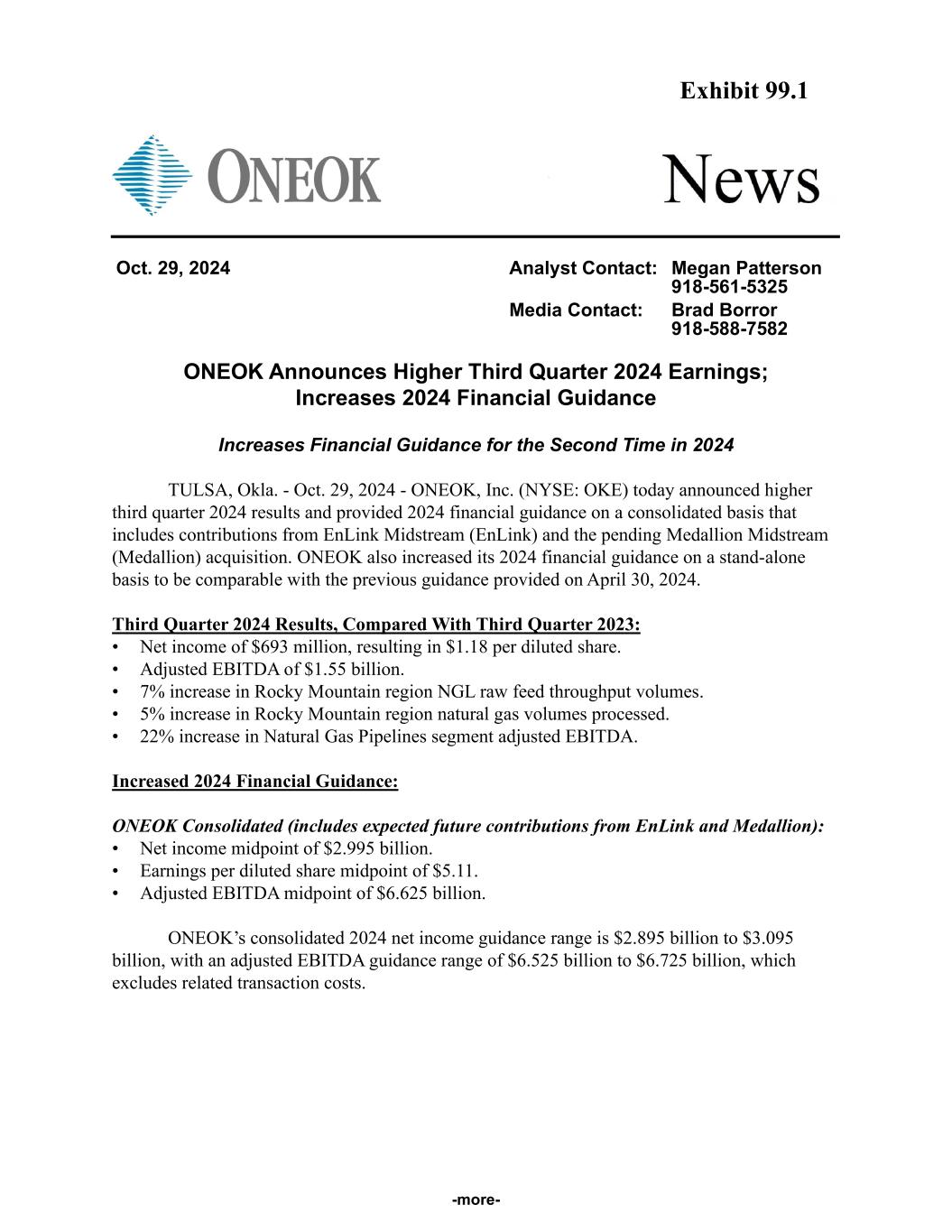 -more- Oct. 29, 2024 Analyst Contact: Megan Patterson 918-561-5325 Media Contact: Brad Borror 918-588-7582 ONEOK Announces Higher Third Quarter 2024 Earnings; Increases 2024 Financial Guidance Increases Financial Guidance for the Second Time in 2024 TULSA, Okla. - Oct. 29, 2024 - ONEOK, Inc. (NYSE: OKE) today announced higher third quarter 2024 results and provided 2024 financial guidance on a consolidated basis that includes contributions from EnLink Midstream (EnLink) and the pending Medallion Midstream (Medallion) acquisition. ONEOK also increased its 2024 financial guidance on a stand-alone basis to be comparable with the previous guidance provided on April 30, 2024. Third Quarter 2024 Results, Compared With Third Quarter 2023: • Net income of $693 million, resulting in $1.18 per diluted share. • Adjusted EBITDA of $1.55 billion. • 7% increase in Rocky Mountain region NGL raw feed throughput volumes. • 5% increase in Rocky Mountain region natural gas volumes processed. • 22% increase in Natural Gas Pipelines segment adjusted EBITDA. Increased 2024 Financial Guidance: ONEOK Consolidated (includes expected future contributions from EnLink and Medallion): • Net income midpoint of $2.995 billion. • Earnings per diluted share midpoint of $5.11. • Adjusted EBITDA midpoint of $6.625 billion. ONEOK’s consolidated 2024 net income guidance range is $2.895 billion to $3.095 billion, with an adjusted EBITDA guidance range of $6.525 billion to $6.725 billion, which excludes related transaction costs. Exhibit 99.1