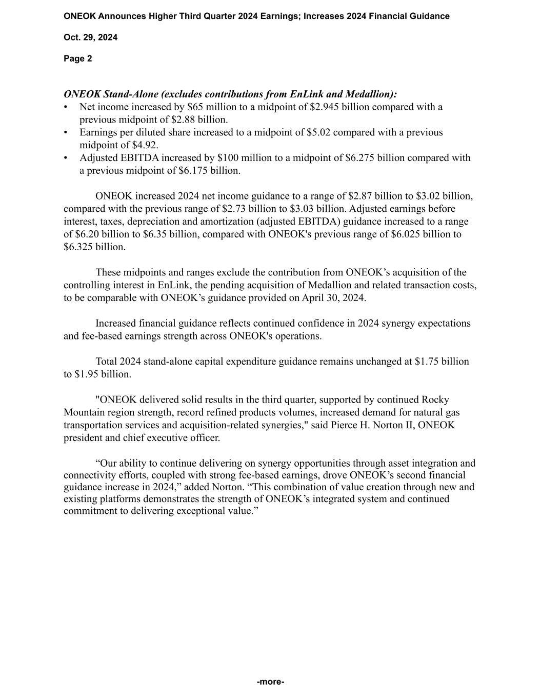 ONEOK Announces Higher Third Quarter 2024 Earnings; Increases 2024 Financial Guidance Oct. 29, 2024 Page 2 -more- ONEOK Stand-Alone (excludes contributions from EnLink and Medallion): • Net income increased by $65 million to a midpoint of $2.945 billion compared with a previous midpoint of $2.88 billion. • Earnings per diluted share increased to a midpoint of $5.02 compared with a previous midpoint of $4.92. • Adjusted EBITDA increased by $100 million to a midpoint of $6.275 billion compared with a previous midpoint of $6.175 billion. ONEOK increased 2024 net income guidance to a range of $2.87 billion to $3.02 billion, compared with the previous range of $2.73 billion to $3.03 billion. Adjusted earnings before interest, taxes, depreciation and amortization (adjusted EBITDA) guidance increased to a range of $6.20 billion to $6.35 billion, compared with ONEOK's previous range of $6.025 billion to $6.325 billion. These midpoints and ranges exclude the contribution from ONEOK’s acquisition of the controlling interest in EnLink, the pending acquisition of Medallion and related transaction costs, to be comparable with ONEOK’s guidance provided on April 30, 2024. Increased financial guidance reflects continued confidence in 2024 synergy expectations and fee-based earnings strength across ONEOK's operations. Total 2024 stand-alone capital expenditure guidance remains unchanged at $1.75 billion to $1.95 billion. "ONEOK delivered solid results in the third quarter, supported by continued Rocky Mountain region strength, record refined products volumes, increased demand for natural gas transportation services and acquisition-related synergies," said Pierce H. Norton II, ONEOK president and chief executive officer. “Our ability to continue delivering on synergy opportunities through asset integration and connectivity efforts, coupled with strong fee-based earnings, drove ONEOK’s second financial guidance increase in 2024,” added Norton. “This combination of value creation through new and existing platforms demonstrates the strength of ONEOK’s integrated system and continued commitment to delivering exceptional value.”