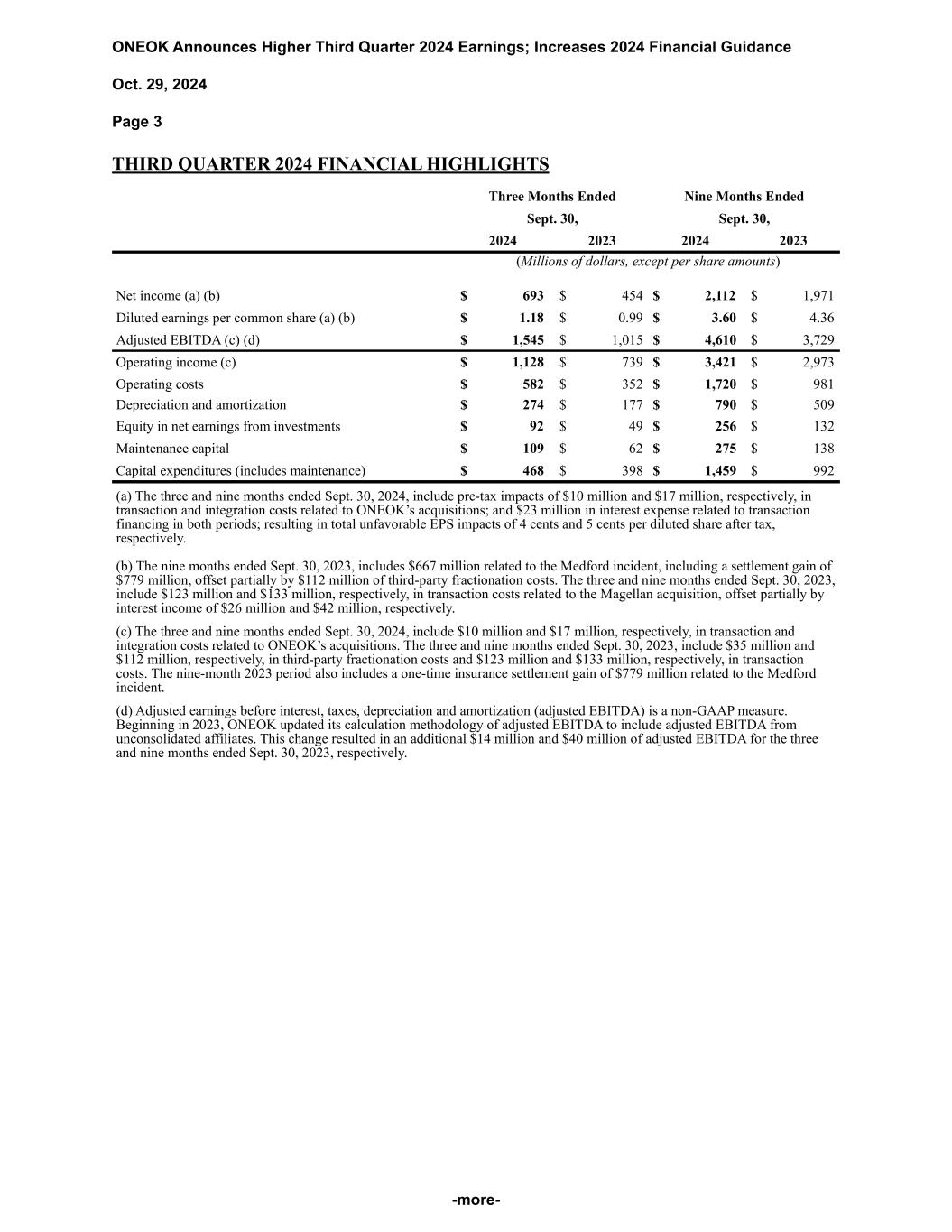 ONEOK Announces Higher Third Quarter 2024 Earnings; Increases 2024 Financial Guidance Oct. 29, 2024 Page 3 -more- THIRD QUARTER 2024 FINANCIAL HIGHLIGHTS Three Months Ended Nine Months Ended Sept. 30, Sept. 30, 2024 2023 2024 2023 (Millions of dollars, except per share amounts) Net income (a) (b) $ 693 $ 454 $ 2,112 $ 1,971 Diluted earnings per common share (a) (b) $ 1.18 $ 0.99 $ 3.60 $ 4.36 Adjusted EBITDA (c) (d) $ 1,545 $ 1,015 $ 4,610 $ 3,729 Operating income (c) $ 1,128 $ 739 $ 3,421 $ 2,973 Operating costs $ 582 $ 352 $ 1,720 $ 981 Depreciation and amortization $ 274 $ 177 $ 790 $ 509 Equity in net earnings from investments $ 92 $ 49 $ 256 $ 132 Maintenance capital $ 109 $ 62 $ 275 $ 138 Capital expenditures (includes maintenance) $ 468 $ 398 $ 1,459 $ 992 (a) The three and nine months ended Sept. 30, 2024, include pre-tax impacts of $10 million and $17 million, respectively, in transaction and integration costs related to ONEOK’s acquisitions; and $23 million in interest expense related to transaction financing in both periods; resulting in total unfavorable EPS impacts of 4 cents and 5 cents per diluted share after tax, respectively. (b) The nine months ended Sept. 30, 2023, includes $667 million related to the Medford incident, including a settlement gain of $779 million, offset partially by $112 million of third-party fractionation costs. The three and nine months ended Sept. 30, 2023, include $123 million and $133 million, respectively, in transaction costs related to the Magellan acquisition, offset partially by interest income of $26 million and $42 million, respectively. (c) The three and nine months ended Sept. 30, 2024, include $10 million and $17 million, respectively, in transaction and integration costs related to ONEOK’s acquisitions. The three and nine months ended Sept. 30, 2023, include $35 million and $112 million, respectively, in third-party fractionation costs and $123 million and $133 million, respectively, in transaction costs. The nine-month 2023 period also includes a one-time insurance settlement gain of $779 million related to the Medford incident. (d) Adjusted earnings before interest, taxes, depreciation and amortization (adjusted EBITDA) is a non-GAAP measure. Beginning in 2023, ONEOK updated its calculation methodology of adjusted EBITDA to include adjusted EBITDA from unconsolidated affiliates. This change resulted in an additional $14 million and $40 million of adjusted EBITDA for the three and nine months ended Sept. 30, 2023, respectively.