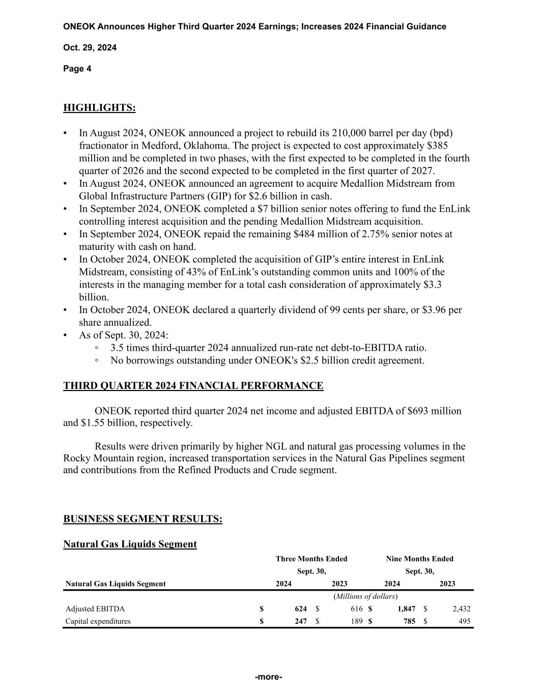 ONEOK Announces Higher Third Quarter 2024 Earnings; Increases 2024 Financial Guidance Oct. 29, 2024 Page 4 -more- HIGHLIGHTS: • In August 2024, ONEOK announced a project to rebuild its 210,000 barrel per day (bpd) fractionator in Medford, Oklahoma. The project is expected to cost approximately $385 million and be completed in two phases, with the first expected to be completed in the fourth quarter of 2026 and the second expected to be completed in the first quarter of 2027. • In August 2024, ONEOK announced an agreement to acquire Medallion Midstream from Global Infrastructure Partners (GIP) for $2.6 billion in cash. • In September 2024, ONEOK completed a $7 billion senior notes offering to fund the EnLink controlling interest acquisition and the pending Medallion Midstream acquisition. • In September 2024, ONEOK repaid the remaining $484 million of 2.75% senior notes at maturity with cash on hand. • In October 2024, ONEOK completed the acquisition of GIP’s entire interest in EnLink Midstream, consisting of 43% of EnLink’s outstanding common units and 100% of the interests in the managing member for a total cash consideration of approximately $3.3 billion. • In October 2024, ONEOK declared a quarterly dividend of 99 cents per share, or $3.96 per share annualized. • As of Sept. 30, 2024: ◦ 3.5 times third-quarter 2024 annualized run-rate net debt-to-EBITDA ratio. ◦ No borrowings outstanding under ONEOK's $2.5 billion credit agreement. THIRD QUARTER 2024 FINANCIAL PERFORMANCE ONEOK reported third quarter 2024 net income and adjusted EBITDA of $693 million and $1.55 billion, respectively. Results were driven primarily by higher NGL and natural gas processing volumes in the Rocky Mountain region, increased transportation services in the Natural Gas Pipelines segment and contributions from the Refined Products and Crude segment. BUSINESS SEGMENT RESULTS: Natural Gas Liquids Segment Three Months Ended Nine Months Ended Sept. 30, Sept. 30, Natural Gas Liquids Segment 2024 2023 2024 2023 (Millions of dollars) Adjusted EBITDA $ 624 $ 616 $ 1,847 $ 2,432 Capital expenditures $ 247 $ 189 $ 785 $ 495