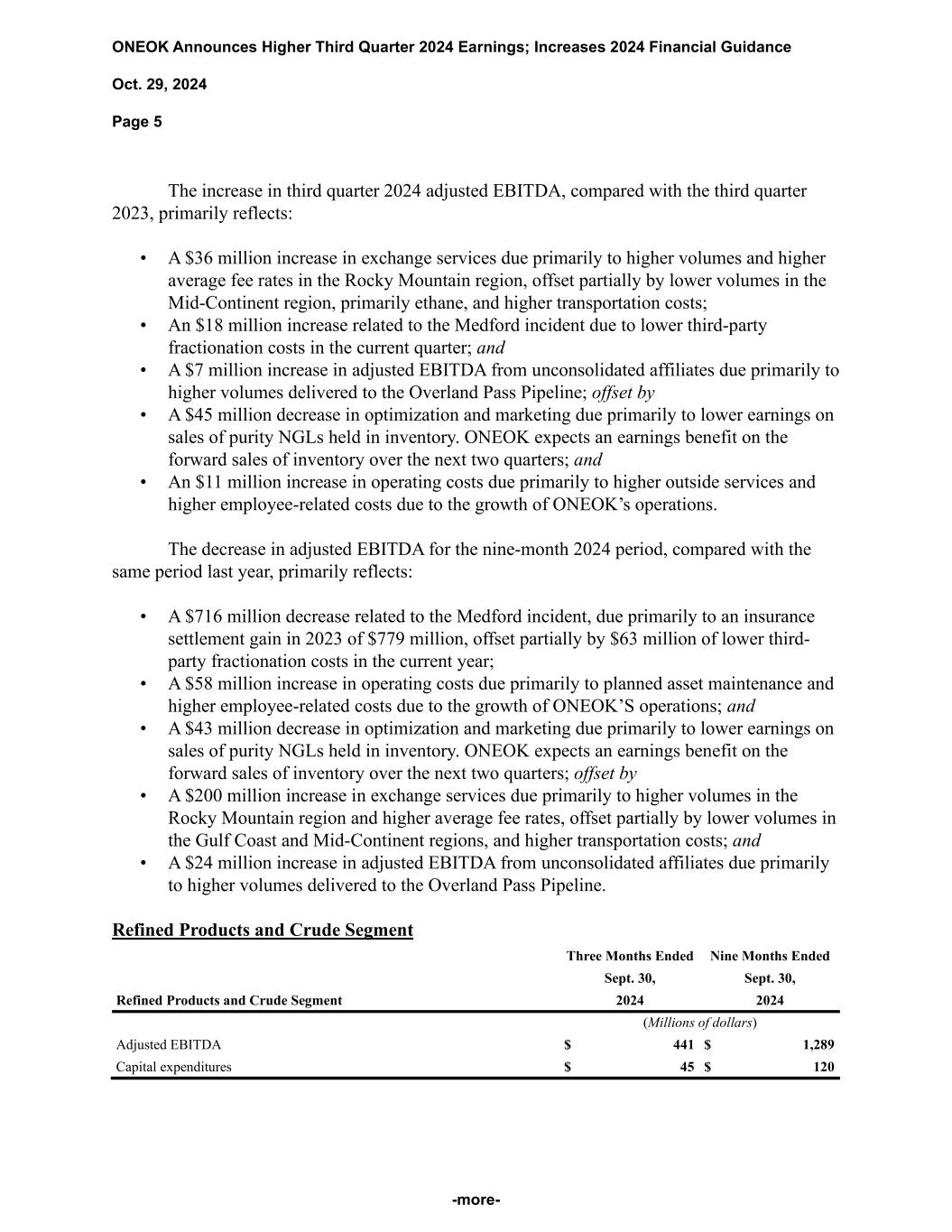ONEOK Announces Higher Third Quarter 2024 Earnings; Increases 2024 Financial Guidance Oct. 29, 2024 Page 5 -more- The increase in third quarter 2024 adjusted EBITDA, compared with the third quarter 2023, primarily reflects: • A $36 million increase in exchange services due primarily to higher volumes and higher average fee rates in the Rocky Mountain region, offset partially by lower volumes in the Mid-Continent region, primarily ethane, and higher transportation costs; • An $18 million increase related to the Medford incident due to lower third-party fractionation costs in the current quarter; and • A $7 million increase in adjusted EBITDA from unconsolidated affiliates due primarily to higher volumes delivered to the Overland Pass Pipeline; offset by • A $45 million decrease in optimization and marketing due primarily to lower earnings on sales of purity NGLs held in inventory. ONEOK expects an earnings benefit on the forward sales of inventory over the next two quarters; and • An $11 million increase in operating costs due primarily to higher outside services and higher employee-related costs due to the growth of ONEOK’s operations. The decrease in adjusted EBITDA for the nine-month 2024 period, compared with the same period last year, primarily reflects: • A $716 million decrease related to the Medford incident, due primarily to an insurance settlement gain in 2023 of $779 million, offset partially by $63 million of lower third- party fractionation costs in the current year; • A $58 million increase in operating costs due primarily to planned asset maintenance and higher employee-related costs due to the growth of ONEOK’S operations; and • A $43 million decrease in optimization and marketing due primarily to lower earnings on sales of purity NGLs held in inventory. ONEOK expects an earnings benefit on the forward sales of inventory over the next two quarters; offset by • A $200 million increase in exchange services due primarily to higher volumes in the Rocky Mountain region and higher average fee rates, offset partially by lower volumes in the Gulf Coast and Mid-Continent regions, and higher transportation costs; and • A $24 million increase in adjusted EBITDA from unconsolidated affiliates due primarily to higher volumes delivered to the Overland Pass Pipeline. Refined Products and Crude Segment Three Months Ended Nine Months Ended Sept. 30, Sept. 30, Refined Products and Crude Segment 2024 2024 (Millions of dollars) Adjusted EBITDA $ 441 $ 1,289 Capital expenditures $ 45 $ 120
