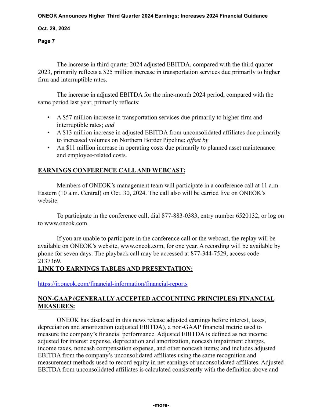 ONEOK Announces Higher Third Quarter 2024 Earnings; Increases 2024 Financial Guidance Oct. 29, 2024 Page 7 -more- The increase in third quarter 2024 adjusted EBITDA, compared with the third quarter 2023, primarily reflects a $25 million increase in transportation services due primarily to higher firm and interruptible rates. The increase in adjusted EBITDA for the nine-month 2024 period, compared with the same period last year, primarily reflects: • A $57 million increase in transportation services due primarily to higher firm and interruptible rates; and • A $13 million increase in adjusted EBITDA from unconsolidated affiliates due primarily to increased volumes on Northern Border Pipeline; offset by • An $11 million increase in operating costs due primarily to planned asset maintenance and employee-related costs. EARNINGS CONFERENCE CALL AND WEBCAST: Members of ONEOK’s management team will participate in a conference call at 11 a.m. Eastern (10 a.m. Central) on Oct. 30, 2024. The call also will be carried live on ONEOK’s website. To participate in the conference call, dial 877-883-0383, entry number 6520132, or log on to www.oneok.com. If you are unable to participate in the conference call or the webcast, the replay will be available on ONEOK’s website, www.oneok.com, for one year. A recording will be available by phone for seven days. The playback call may be accessed at 877-344-7529, access code 2137369. LINK TO EARNINGS TABLES AND PRESENTATION: https://ir.oneok.com/financial-information/financial-reports NON-GAAP (GENERALLY ACCEPTED ACCOUNTING PRINCIPLES) FINANCIAL MEASURES: ONEOK has disclosed in this news release adjusted earnings before interest, taxes, depreciation and amortization (adjusted EBITDA), a non-GAAP financial metric used to measure the company’s financial performance. Adjusted EBITDA is defined as net income adjusted for interest expense, depreciation and amortization, noncash impairment charges, income taxes, noncash compensation expense, and other noncash items; and includes adjusted EBITDA from the company’s unconsolidated affiliates using the same recognition and measurement methods used to record equity in net earnings of unconsolidated affiliates. Adjusted EBITDA from unconsolidated affiliates is calculated consistently with the definition above and