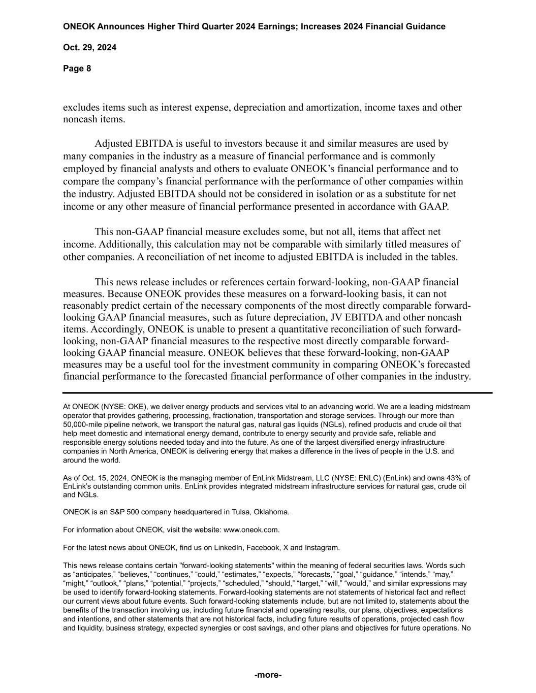 ONEOK Announces Higher Third Quarter 2024 Earnings; Increases 2024 Financial Guidance Oct. 29, 2024 Page 8 -more- excludes items such as interest expense, depreciation and amortization, income taxes and other noncash items. Adjusted EBITDA is useful to investors because it and similar measures are used by many companies in the industry as a measure of financial performance and is commonly employed by financial analysts and others to evaluate ONEOK’s financial performance and to compare the company’s financial performance with the performance of other companies within the industry. Adjusted EBITDA should not be considered in isolation or as a substitute for net income or any other measure of financial performance presented in accordance with GAAP. This non-GAAP financial measure excludes some, but not all, items that affect net income. Additionally, this calculation may not be comparable with similarly titled measures of other companies. A reconciliation of net income to adjusted EBITDA is included in the tables. This news release includes or references certain forward-looking, non-GAAP financial measures. Because ONEOK provides these measures on a forward-looking basis, it can not reasonably predict certain of the necessary components of the most directly comparable forward- looking GAAP financial measures, such as future depreciation, JV EBITDA and other noncash items. Accordingly, ONEOK is unable to present a quantitative reconciliation of such forward- looking, non-GAAP financial measures to the respective most directly comparable forward- looking GAAP financial measure. ONEOK believes that these forward-looking, non-GAAP measures may be a useful tool for the investment community in comparing ONEOK’s forecasted financial performance to the forecasted financial performance of other companies in the industry. At ONEOK (NYSE: OKE), we deliver energy products and services vital to an advancing world. We are a leading midstream operator that provides gathering, processing, fractionation, transportation and storage services. Through our more than 50,000-mile pipeline network, we transport the natural gas, natural gas liquids (NGLs), refined products and crude oil that help meet domestic and international energy demand, contribute to energy security and provide safe, reliable and responsible energy solutions needed today and into the future. As one of the largest diversified energy infrastructure companies in North America, ONEOK is delivering energy that makes a difference in the lives of people in the U.S. and around the world. As of Oct. 15, 2024, ONEOK is the managing member of EnLink Midstream, LLC (NYSE: ENLC) (EnLink) and owns 43% of EnLink’s outstanding common units. EnLink provides integrated midstream infrastructure services for natural gas, crude oil and NGLs. ONEOK is an S&P 500 company headquartered in Tulsa, Oklahoma. For information about ONEOK, visit the website: www.oneok.com. For the latest news about ONEOK, find us on LinkedIn, Facebook, X and Instagram. This news release contains certain "forward-looking statements" within the meaning of federal securities laws. Words such as “anticipates,” “believes,” “continues,” “could,” “estimates,” “expects,” “forecasts,” “goal,” “guidance,” “intends,” “may,” “might,” “outlook,” “plans,” “potential,” “projects,” “scheduled,” “should,” “target,” “will,” “would,” and similar expressions may be used to identify forward-looking statements. Forward-looking statements are not statements of historical fact and reflect our current views about future events. Such forward-looking statements include, but are not limited to, statements about the benefits of the transaction involving us, including future financial and operating results, our plans, objectives, expectations and intentions, and other statements that are not historical facts, including future results of operations, projected cash flow and liquidity, business strategy, expected synergies or cost savings, and other plans and objectives for future operations. No