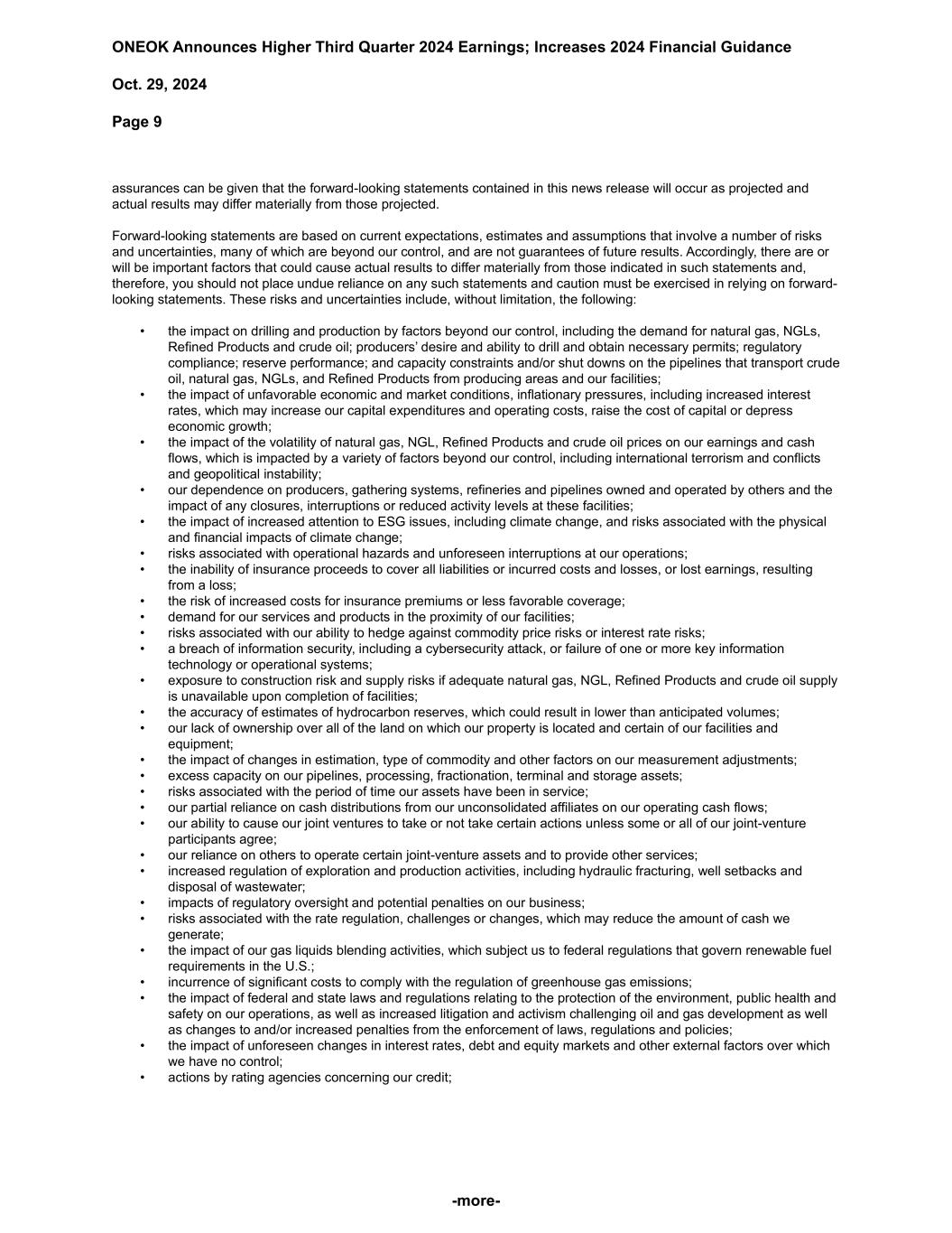 ONEOK Announces Higher Third Quarter 2024 Earnings; Increases 2024 Financial Guidance Oct. 29, 2024 Page 9 -more- assurances can be given that the forward-looking statements contained in this news release will occur as projected and actual results may differ materially from those projected. Forward-looking statements are based on current expectations, estimates and assumptions that involve a number of risks and uncertainties, many of which are beyond our control, and are not guarantees of future results. Accordingly, there are or will be important factors that could cause actual results to differ materially from those indicated in such statements and, therefore, you should not place undue reliance on any such statements and caution must be exercised in relying on forward- looking statements. These risks and uncertainties include, without limitation, the following: • the impact on drilling and production by factors beyond our control, including the demand for natural gas, NGLs, Refined Products and crude oil; producers’ desire and ability to drill and obtain necessary permits; regulatory compliance; reserve performance; and capacity constraints and/or shut downs on the pipelines that transport crude oil, natural gas, NGLs, and Refined Products from producing areas and our facilities; • the impact of unfavorable economic and market conditions, inflationary pressures, including increased interest rates, which may increase our capital expenditures and operating costs, raise the cost of capital or depress economic growth; • the impact of the volatility of natural gas, NGL, Refined Products and crude oil prices on our earnings and cash flows, which is impacted by a variety of factors beyond our control, including international terrorism and conflicts and geopolitical instability; • our dependence on producers, gathering systems, refineries and pipelines owned and operated by others and the impact of any closures, interruptions or reduced activity levels at these facilities; • the impact of increased attention to ESG issues, including climate change, and risks associated with the physical and financial impacts of climate change; • risks associated with operational hazards and unforeseen interruptions at our operations; • the inability of insurance proceeds to cover all liabilities or incurred costs and losses, or lost earnings, resulting from a loss; • the risk of increased costs for insurance premiums or less favorable coverage; • demand for our services and products in the proximity of our facilities; • risks associated with our ability to hedge against commodity price risks or interest rate risks; • a breach of information security, including a cybersecurity attack, or failure of one or more key information technology or operational systems; • exposure to construction risk and supply risks if adequate natural gas, NGL, Refined Products and crude oil supply is unavailable upon completion of facilities; • the accuracy of estimates of hydrocarbon reserves, which could result in lower than anticipated volumes; • our lack of ownership over all of the land on which our property is located and certain of our facilities and equipment; • the impact of changes in estimation, type of commodity and other factors on our measurement adjustments; • excess capacity on our pipelines, processing, fractionation, terminal and storage assets; • risks associated with the period of time our assets have been in service; • our partial reliance on cash distributions from our unconsolidated affiliates on our operating cash flows; • our ability to cause our joint ventures to take or not take certain actions unless some or all of our joint-venture participants agree; • our reliance on others to operate certain joint-venture assets and to provide other services; • increased regulation of exploration and production activities, including hydraulic fracturing, well setbacks and disposal of wastewater; • impacts of regulatory oversight and potential penalties on our business; • risks associated with the rate regulation, challenges or changes, which may reduce the amount of cash we generate; • the impact of our gas liquids blending activities, which subject us to federal regulations that govern renewable fuel requirements in the U.S.; • incurrence of significant costs to comply with the regulation of greenhouse gas emissions; • the impact of federal and state laws and regulations relating to the protection of the environment, public health and safety on our operations, as well as increased litigation and activism challenging oil and gas development as well as changes to and/or increased penalties from the enforcement of laws, regulations and policies; • the impact of unforeseen changes in interest rates, debt and equity markets and other external factors over which we have no control; • actions by rating agencies concerning our credit;