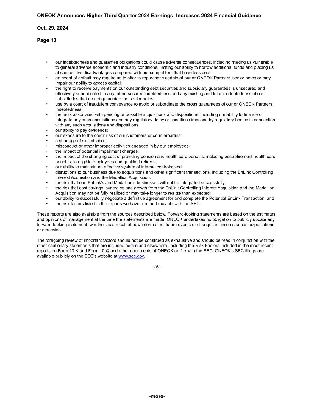 ONEOK Announces Higher Third Quarter 2024 Earnings; Increases 2024 Financial Guidance Oct. 29, 2024 Page 10 -more- • our indebtedness and guarantee obligations could cause adverse consequences, including making us vulnerable to general adverse economic and industry conditions, limiting our ability to borrow additional funds and placing us at competitive disadvantages compared with our competitors that have less debt; • an event of default may require us to offer to repurchase certain of our or ONEOK Partners’ senior notes or may impair our ability to access capital; • the right to receive payments on our outstanding debt securities and subsidiary guarantees is unsecured and effectively subordinated to any future secured indebtedness and any existing and future indebtedness of our subsidiaries that do not guarantee the senior notes; • use by a court of fraudulent conveyance to avoid or subordinate the cross guarantees of our or ONEOK Partners’ indebtedness; • the risks associated with pending or possible acquisitions and dispositions, including our ability to finance or integrate any such acquisitions and any regulatory delay or conditions imposed by regulatory bodies in connection with any such acquisitions and dispositions; • our ability to pay dividends; • our exposure to the credit risk of our customers or counterparties; • a shortage of skilled labor; • misconduct or other improper activities engaged in by our employees; • the impact of potential impairment charges; • the impact of the changing cost of providing pension and health care benefits, including postretirement health care benefits, to eligible employees and qualified retirees; • our ability to maintain an effective system of internal controls; and • disruptions to our business due to acquisitions and other significant transactions, including the EnLink Controlling Interest Acquisition and the Medallion Acquisition; • the risk that our, EnLink’s and Medallion’s businesses will not be integrated successfully; • the risk that cost savings, synergies and growth from the EnLink Controlling Interest Acquisition and the Medallion Acquisition may not be fully realized or may take longer to realize than expected; • our ability to successfully negotiate a definitive agreement for and complete the Potential EnLink Transaction; and • the risk factors listed in the reports we have filed and may file with the SEC. These reports are also available from the sources described below. Forward-looking statements are based on the estimates and opinions of management at the time the statements are made. ONEOK undertakes no obligation to publicly update any forward-looking statement, whether as a result of new information, future events or changes in circumstances, expectations or otherwise. The foregoing review of important factors should not be construed as exhaustive and should be read in conjunction with the other cautionary statements that are included herein and elsewhere, including the Risk Factors included in the most recent reports on Form 10-K and Form 10-Q and other documents of ONEOK on file with the SEC. ONEOK's SEC filings are available publicly on the SEC's website at www.sec.gov. ###