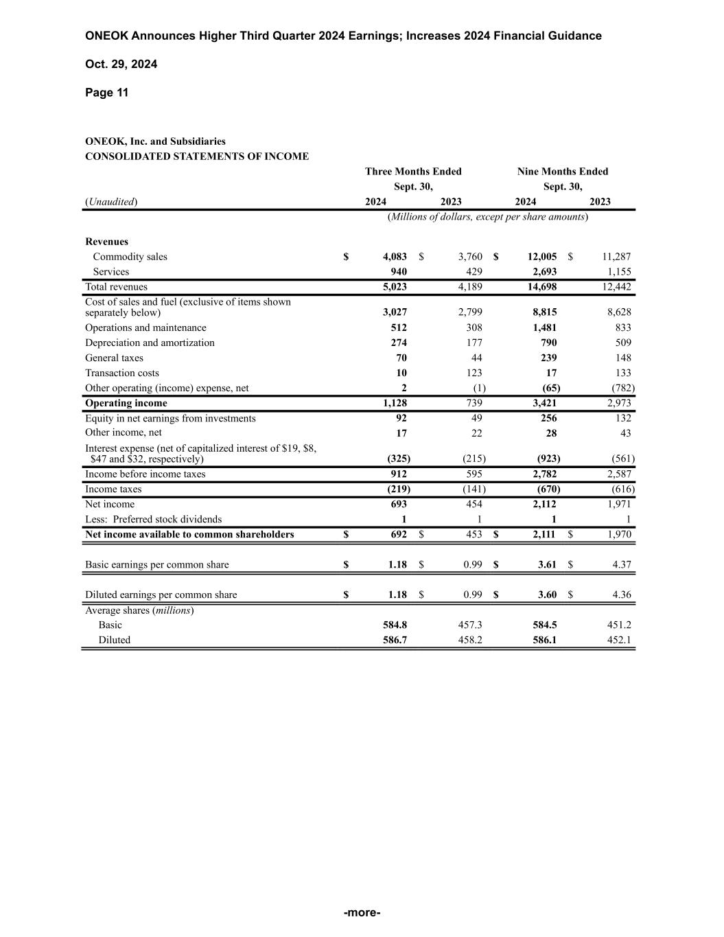 ONEOK Announces Higher Third Quarter 2024 Earnings; Increases 2024 Financial Guidance Oct. 29, 2024 Page 11 -more- ONEOK, Inc. and Subsidiaries CONSOLIDATED STATEMENTS OF INCOME Three Months Ended Nine Months Ended Sept. 30, Sept. 30, (Unaudited) 2024 2023 2024 2023 (Millions of dollars, except per share amounts) Revenues Commodity sales $ 4,083 $ 3,760 $ 12,005 $ 11,287 Services 940 429 2,693 1,155 Total revenues 5,023 4,189 14,698 12,442 Cost of sales and fuel (exclusive of items shown separately below) 3,027 2,799 8,815 8,628 Operations and maintenance 512 308 1,481 833 Depreciation and amortization 274 177 790 509 General taxes 70 44 239 148 Transaction costs 10 123 17 133 Other operating (income) expense, net 2 (1) (65) (782) Operating income 1,128 739 3,421 2,973 Equity in net earnings from investments 92 49 256 132 Other income, net 17 22 28 43 Interest expense (net of capitalized interest of $19, $8, $47 and $32, respectively) (325) (215) (923) (561) Income before income taxes 912 595 2,782 2,587 Income taxes (219) (141) (670) (616) Net income 693 454 2,112 1,971 Less: Preferred stock dividends 1 1 1 1 Net income available to common shareholders $ 692 $ 453 $ 2,111 $ 1,970 Basic earnings per common share $ 1.18 $ 0.99 $ 3.61 $ 4.37 Diluted earnings per common share $ 1.18 $ 0.99 $ 3.60 $ 4.36 Average shares (millions) Basic 584.8 457.3 584.5 451.2 Diluted 586.7 458.2 586.1 452.1