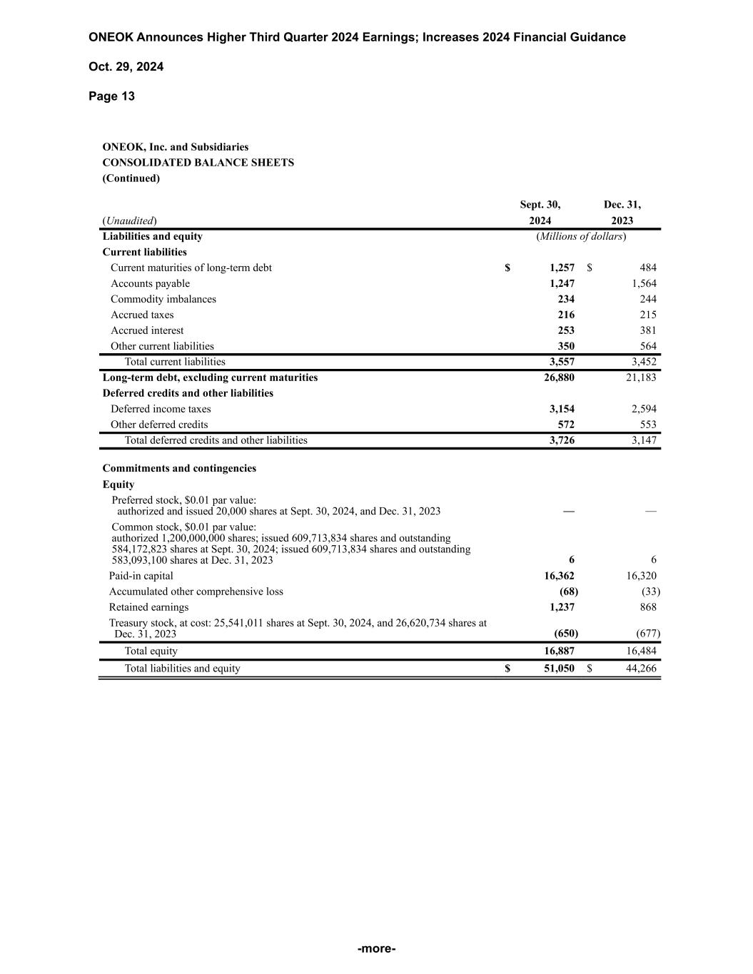 ONEOK Announces Higher Third Quarter 2024 Earnings; Increases 2024 Financial Guidance Oct. 29, 2024 Page 13 -more- ONEOK, Inc. and Subsidiaries CONSOLIDATED BALANCE SHEETS (Continued) Sept. 30, Dec. 31, (Unaudited) 2024 2023 Liabilities and equity (Millions of dollars) Current liabilities Current maturities of long-term debt $ 1,257 $ 484 Accounts payable 1,247 1,564 Commodity imbalances 234 244 Accrued taxes 216 215 Accrued interest 253 381 Other current liabilities 350 564 Total current liabilities 3,557 3,452 Long-term debt, excluding current maturities 26,880 21,183 Deferred credits and other liabilities Deferred income taxes 3,154 2,594 Other deferred credits 572 553 Total deferred credits and other liabilities 3,726 3,147 Commitments and contingencies Equity Preferred stock, $0.01 par value: authorized and issued 20,000 shares at Sept. 30, 2024, and Dec. 31, 2023 — — Common stock, $0.01 par value: authorized 1,200,000,000 shares; issued 609,713,834 shares and outstanding 584,172,823 shares at Sept. 30, 2024; issued 609,713,834 shares and outstanding 583,093,100 shares at Dec. 31, 2023 6 6 Paid-in capital 16,362 16,320 Accumulated other comprehensive loss (68) (33) Retained earnings 1,237 868 Treasury stock, at cost: 25,541,011 shares at Sept. 30, 2024, and 26,620,734 shares at Dec. 31, 2023 (650) (677) Total equity 16,887 16,484 Total liabilities and equity $ 51,050 $ 44,266