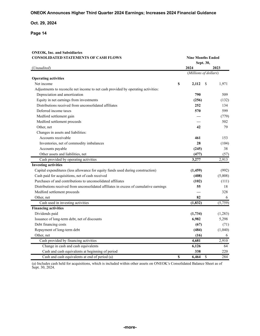 ONEOK Announces Higher Third Quarter 2024 Earnings; Increases 2024 Financial Guidance Oct. 29, 2024 Page 14 -more- ONEOK, Inc. and Subsidiaries CONSOLIDATED STATEMENTS OF CASH FLOWS Nine Months Ended Sept. 30, (Unaudited) 2024 2023 (Millions of dollars) Operating activities Net income $ 2,112 $ 1,971 Adjustments to reconcile net income to net cash provided by operating activities: Depreciation and amortization 790 509 Equity in net earnings from investments (256) (132) Distributions received from unconsolidated affiliates 252 134 Deferred income taxes 570 599 Medford settlement gain — (779) Medford settlement proceeds — 502 Other, net 42 79 Changes in assets and liabilities: Accounts receivable 461 153 Inventories, net of commodity imbalances 28 (104) Accounts payable (245) 38 Other assets and liabilities, net (477) (57) Cash provided by operating activities 3,277 2,913 Investing activities Capital expenditures (less allowance for equity funds used during construction) (1,459) (992) Cash paid for acquisitions, net of cash received (408) (5,008) Purchases of and contributions to unconsolidated affiliates (102) (111) Distributions received from unconsolidated affiliates in excess of cumulative earnings 55 18 Medford settlement proceeds — 328 Other, net 82 6 Cash used in investing activities (1,832) (5,759) Financing activities Dividends paid (1,734) (1,283) Issuance of long-term debt, net of discounts 6,982 5,298 Debt financing costs (67) (71) Repayment of long-term debt (484) (1,040) Other, net (16) 6 Cash provided by financing activities 4,681 2,910 Change in cash and cash equivalents 6,126 64 Cash and cash equivalents at beginning of period 338 220 Cash and cash equivalents at end of period (a) $ 6,464 $ 284 (a) Includes cash held for acquisitions, which is included within other assets on ONEOK’s Consolidated Balance Sheet as of Sept. 30, 2024.