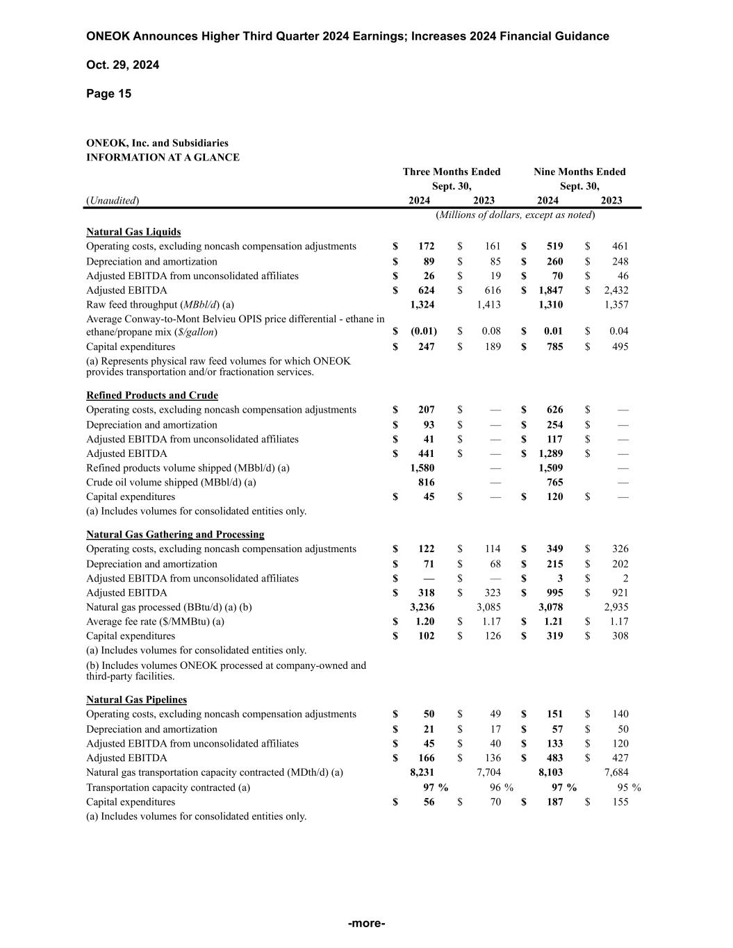 ONEOK Announces Higher Third Quarter 2024 Earnings; Increases 2024 Financial Guidance Oct. 29, 2024 Page 15 -more- ONEOK, Inc. and Subsidiaries INFORMATION AT A GLANCE Three Months Ended Nine Months Ended Sept. 30, Sept. 30, (Unaudited) 2024 2023 2024 2023 (Millions of dollars, except as noted) Natural Gas Liquids Operating costs, excluding noncash compensation adjustments $ 172 $ 161 $ 519 $ 461 Depreciation and amortization $ 89 $ 85 $ 260 $ 248 Adjusted EBITDA from unconsolidated affiliates $ 26 $ 19 $ 70 $ 46 Adjusted EBITDA $ 624 $ 616 $ 1,847 $ 2,432 Raw feed throughput (MBbl/d) (a) 1,324 1,413 1,310 1,357 Average Conway-to-Mont Belvieu OPIS price differential - ethane in ethane/propane mix ($/gallon) $ (0.01) $ 0.08 $ 0.01 $ 0.04 Capital expenditures $ 247 $ 189 $ 785 $ 495 (a) Represents physical raw feed volumes for which ONEOK provides transportation and/or fractionation services. Refined Products and Crude Operating costs, excluding noncash compensation adjustments $ 207 $ — $ 626 $ — Depreciation and amortization $ 93 $ — $ 254 $ — Adjusted EBITDA from unconsolidated affiliates $ 41 $ — $ 117 $ — Adjusted EBITDA $ 441 $ — $ 1,289 $ — Refined products volume shipped (MBbl/d) (a) 1,580 — 1,509 — Crude oil volume shipped (MBbl/d) (a) 816 — 765 — Capital expenditures $ 45 $ — $ 120 $ — (a) Includes volumes for consolidated entities only. Natural Gas Gathering and Processing Operating costs, excluding noncash compensation adjustments $ 122 $ 114 $ 349 $ 326 Depreciation and amortization $ 71 $ 68 $ 215 $ 202 Adjusted EBITDA from unconsolidated affiliates $ — $ — $ 3 $ 2 Adjusted EBITDA $ 318 $ 323 $ 995 $ 921 Natural gas processed (BBtu/d) (a) (b) 3,236 3,085 3,078 2,935 Average fee rate ($/MMBtu) (a) $ 1.20 $ 1.17 $ 1.21 $ 1.17 Capital expenditures $ 102 $ 126 $ 319 $ 308 (a) Includes volumes for consolidated entities only. (b) Includes volumes ONEOK processed at company-owned and third-party facilities. Natural Gas Pipelines Operating costs, excluding noncash compensation adjustments $ 50 $ 49 $ 151 $ 140 Depreciation and amortization $ 21 $ 17 $ 57 $ 50 Adjusted EBITDA from unconsolidated affiliates $ 45 $ 40 $ 133 $ 120 Adjusted EBITDA $ 166 $ 136 $ 483 $ 427 Natural gas transportation capacity contracted (MDth/d) (a) 8,231 7,704 8,103 7,684 Transportation capacity contracted (a) 97 % 96 % 97 % 95 % Capital expenditures $ 56 $ 70 $ 187 $ 155 (a) Includes volumes for consolidated entities only.