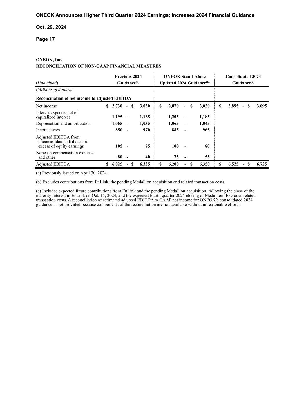 ONEOK Announces Higher Third Quarter 2024 Earnings; Increases 2024 Financial Guidance Oct. 29, 2024 Page 17 -more- ONEOK, Inc. RECONCILIATION OF NON-GAAP FINANCIAL MEASURES Previous 2024 ONEOK Stand-Alone Consolidated 2024 (Unaudited) Guidance(a) Updated 2024 Guidance(b) Guidance(c) (Millions of dollars) Reconciliation of net income to adjusted EBITDA Net income $ 2,730 - $ 3,030 $ 2,870 - $ 3,020 $ 2,895 - $ 3,095 Interest expense, net of capitalized interest 1,195 - 1,165 1,205 - 1,185 Depreciation and amortization 1,065 - 1,035 1,065 - 1,045 Income taxes 850 - 970 885 - 965 Adjusted EBITDA from unconsolidated affiliates in excess of equity earnings 105 - 85 100 - 80 Noncash compensation expense and other 80 - 40 75 - 55 Adjusted EBITDA $ 6,025 - $ 6,325 $ 6,200 - $ 6,350 $ 6,525 - $ 6,725 (a) Previously issued on April 30, 2024. (b) Excludes contributions from EnLink, the pending Medallion acquisition and related transaction costs. (c) Includes expected future contributions from EnLink and the pending Medallion acquisition, following the close of the majority interest in EnLink on Oct. 15, 2024, and the expected fourth quarter 2024 closing of Medallion. Excludes related transaction costs. A reconciliation of estimated adjusted EBITDA to GAAP net income for ONEOK’s consolidated 2024 guidance is not provided because components of the reconciliation are not available without unreasonable efforts.